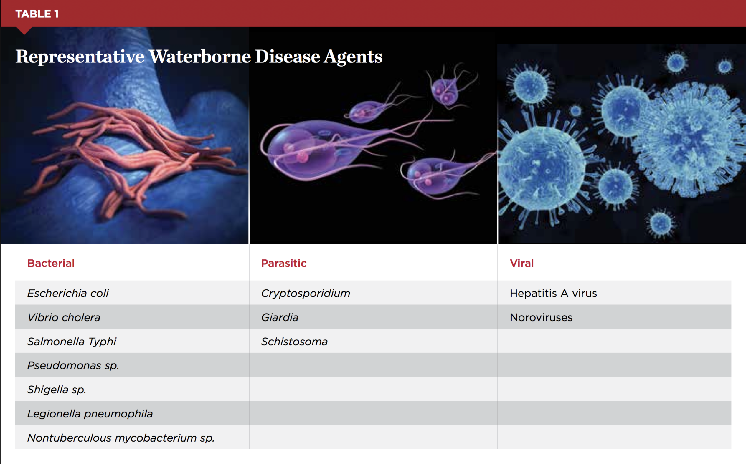 Infections and diseases caused by waterborne organisms remain a major source of global morbidity and mortality.1 These include pathologies caused by a variety of bacteria, protozoa, viruses, and intestinal parasites. Many are able to thrive and proliferate in contaminated natural water sources as well as in man-made systems containing waterlines designed to provide water for public consumption, building equipment, and use in healthcare facilities. While certain well-known bacterial pathogens (ie, Salmonella Typhi, Vibrio cholerae, Escherichia coli) are responsible for a substantial portion of the disease burden, especially in developing countries, a number of new pathogens transmitted by contaminated water have been described in recent decades. These include Cryptosporidium parvum (1976), Legionella pneumophila (1977), and noroviruses (1972), as well as more virulent strains of previously known bacteria, such as Vibrio cholerae O139:H7 (1992). A partial list of major infectious agents that can be spread by water is presented in Table 1.