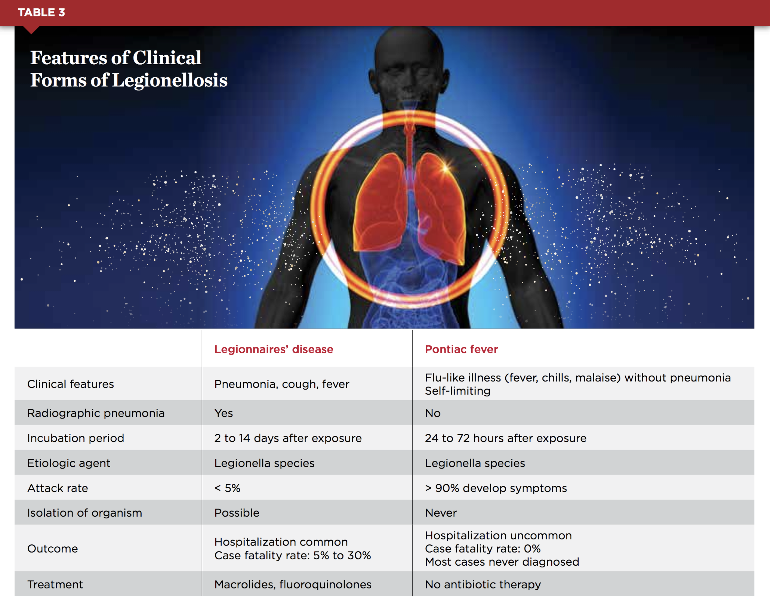 Although Legionella species are ubiquitous in many aqueous environments, they rarely cause disease. Despite this fact, L. pneumophila is the most commonly reported cause of waterborne legionellosis infections and outbreaks among humans. These organisms are not typically considered to be highly virulent pathogens; instead, they are classified as “opportunistic pathogens” and frequently found to cause respiratory disease manifestations in immunocompromised individuals. Infection develops after aerosolized bacteria enter the lungs, where they are encountered by alveolar macrophages and phagocytized. Next, the bacteria produce virulence factors that allow the engulfed Legionella to both survive and replicate within the inflammatory cell. Eventually, the macrophage lyses, and the increased concentration of bacteria is released to affect other phagocytic cells. As the microbial concentrations increase dramatically, other cells (eg, neutrophils, other macrophages, erythrocytes) infiltrate the alveoli, resulting in increased capillary permeability (ie, edema). Two clinical forms of legionellosis are known: Legionnaires’ disease and Pontiac fever (Table 3).13,14