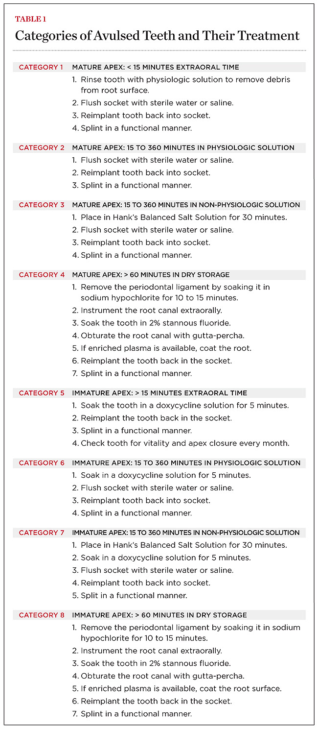 Avulsed teeth present at the dental office in eight basic categories, and only those in category 1 benefit from immediate reimplantation. The other seven categories are better treated with various other types of pre-reimplantation conditioning (see Table 1).
