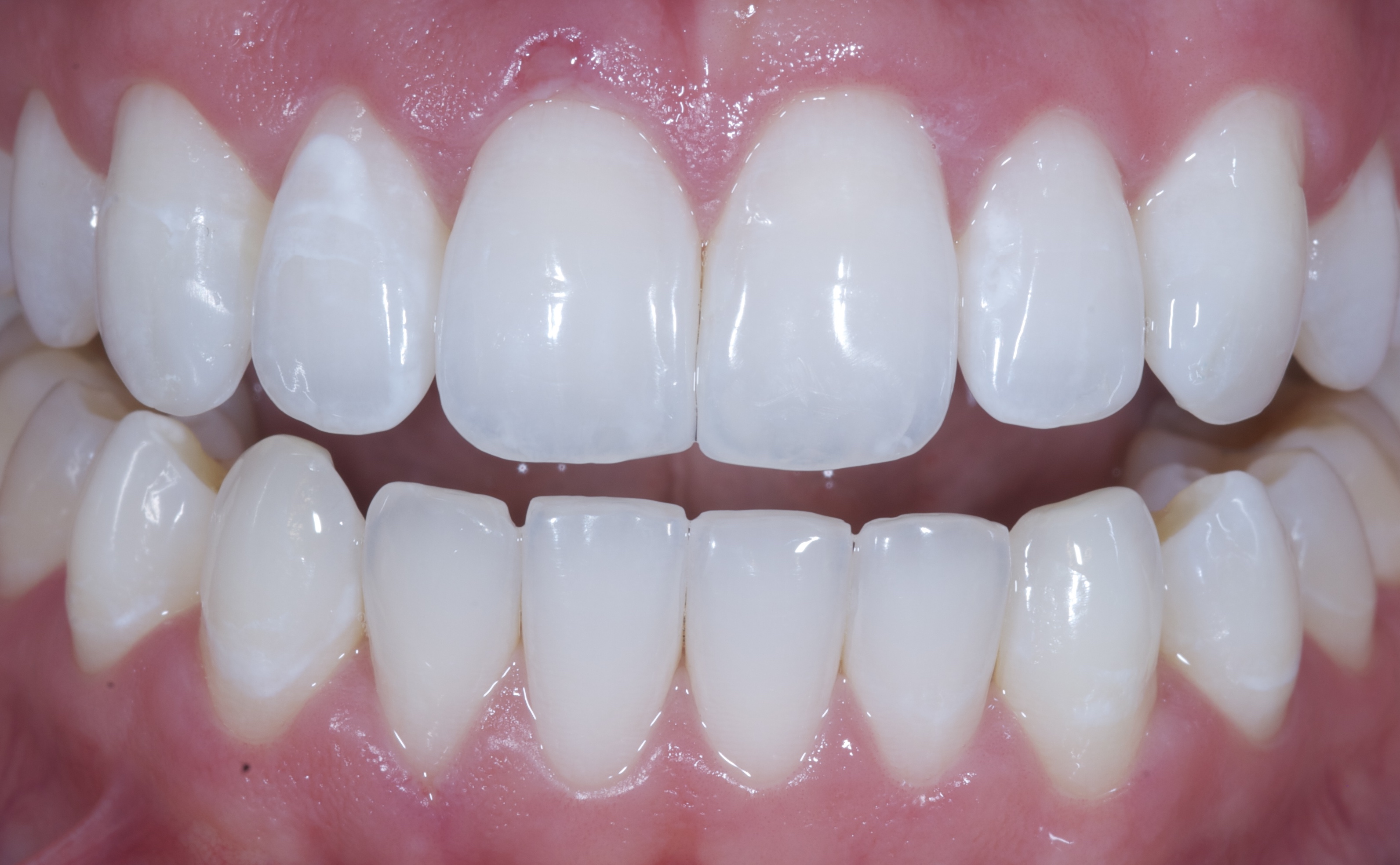 The residual oxygen from the bleach decreases the bond strength; therefore, it may require a minimum of 7 days for the bond strength to return to normal (Figure 9).14 Two weeks later, anesthesia was administered, and all extrinsic stains on the teeth were removed using pumice on a soft prophy brush. Shade selection and mockup were immediately performed. Shade selection was accomplished by curing small increments of enamel shades (Filtek™ Supreme Ultra A1E and B1E, 3M ESPE; Premise™ B1E, Kerr Dental, www.kerrdental.com; and IPS Empress® Direct B1E, Ivoclar Vivadent, www.ivoclarvivadent.com) onto the teeth to be treated. In this case, Ivoclar IPS Empress Direct B1E was determined to have the best match to the surrounding tooth structure.