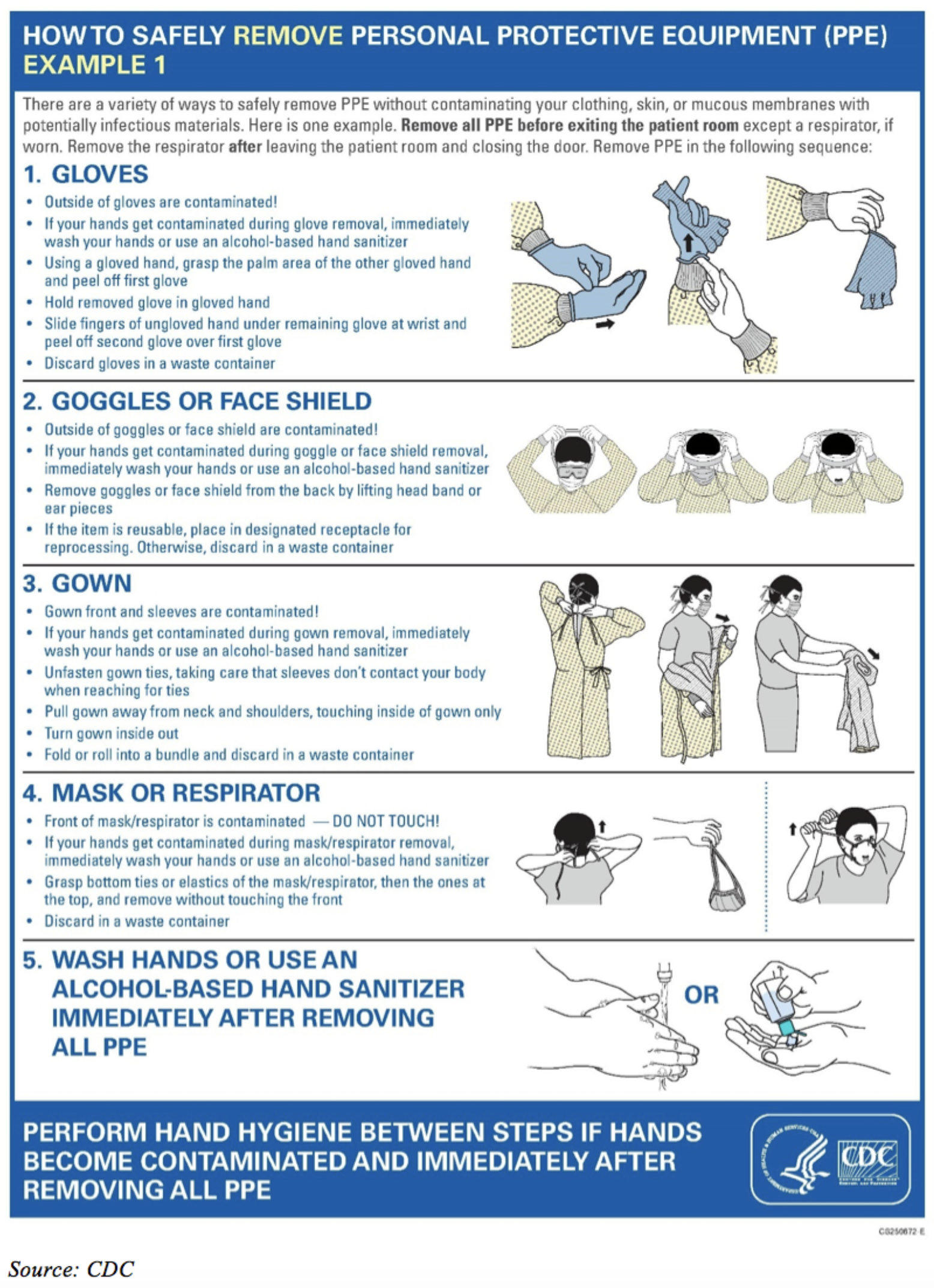 The skin and clothing of healthcare personnel can get contaminated during removal of PPE. This could contribute to dissemination of pathogens and it places personnel at risk for infection. In one study, contamination of the skin and regular clothing of healthcare personnel occurred frequently during removal of contaminated gloves or gowns because of improper removal technique and poor PPE design.19 Another study indicated that under usual conditions, about half of healthcare workers correctly removed their PPE and very few removed it in the correct order and disposed of it properly.20 The CDC has produced instructive material that demonstrates the sequence for donning and removing PPE (Figure 2 through Figure 4). Posters provide key instructions to reinforce safe practices and are intended to limit the spread of contamination. Much of the material presented is appropriate for dentistry.21