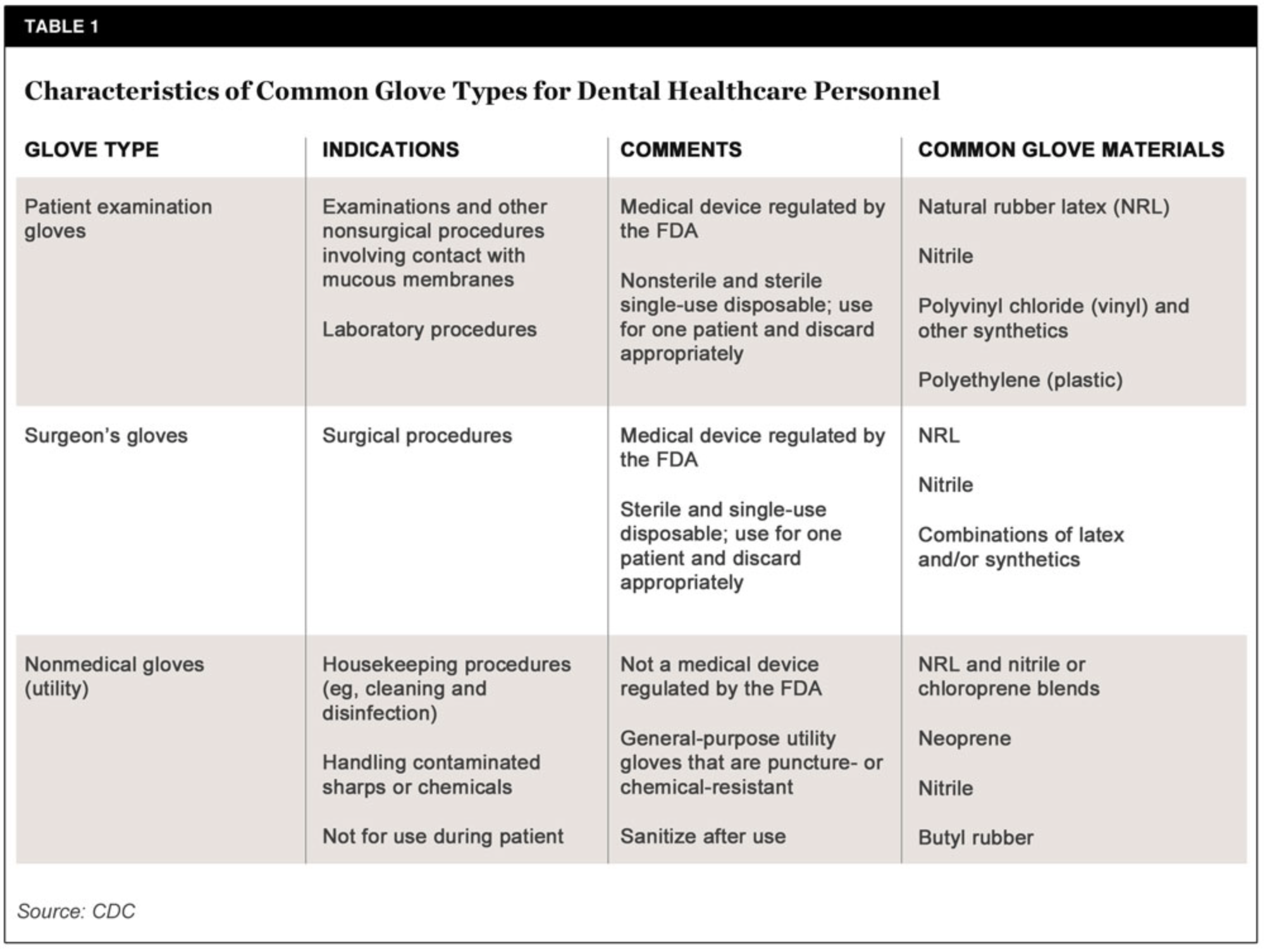The Centers for Disease Control and Prevention (CDC) has prepared a table describing characteristics of common glove types (Table 1).12