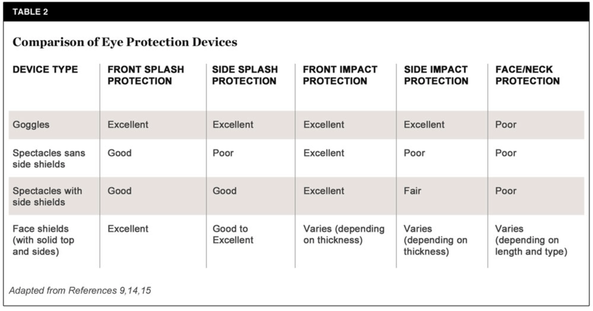 Table 2 provides a comparison of eye protection devices.10,16,17