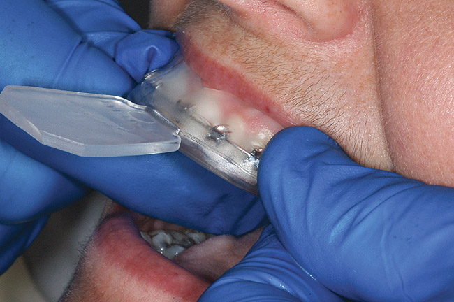 In addition to having a custom-fitted tray that provides a carrier for the bleaching material to remove the plaque and elevate the pH, the tray also provides additional benefits. Because it was made with the patient occluding into maximum intercuspation, the patient has a stable MI bite registration in which to rest. Often during orthodontic therapy, there may be times when one tooth hits high, and becomes sore. The tray levels the occlusion so all teeth are in contact and provides a relief to occlusal trauma even when no bleaching material is added.