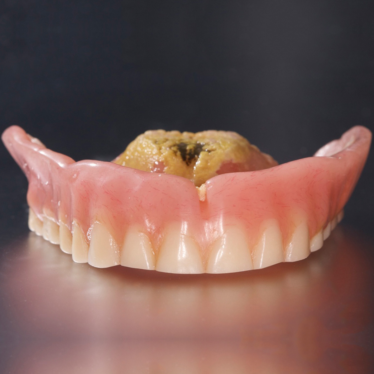 The maintenance of appropriate hygiene for oral tissues and the prostheses helps maintain the overall oral health of the denture patient.16 Hygiene is a crucial factor that aids in promoting the long-term success of dentures.16 Poor oral and denture hygiene is usually attributed to a lack of patient motivation or awareness, the presence of complicated restorations, and/or poor dexterity (Figure 8).16 Patients' previous oral and denture hygiene habits can be an indicator of how they will comply with new dentures.3 Patients who demonstrate poor or nonexistent denture and oral hygiene should be educated, trained, and observed for a period of time. New prostheses should be fabricated only when the patient is exhibiting acceptable oral hygiene habits. The cameo surface contour and the decision to create surface characteristics such as diastema, festooning, and stippling should be influenced by the oral hygiene practices of the denture wearer, because these surface characteristics can make oral hygiene more challenging for those with limited dexterity or vision.