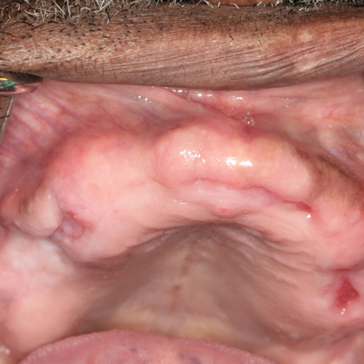 Prolonged usage of an old denture may lead to problems with flange extensions.4 Overextended flanges may result in tissue trauma (Figure 9). They must be relieved and adjusted appropriately, and the patient should be recalled regularly for evaluation.4 Prominent frenum attachments can prevent the development of an optimal border seal and may require surgical repositioning or removal.4 The presence of depressed irregularities, exostoses, tori, hypertrophic tuberosities, and significant undercut areas in the denture foundation should be noted. Surgical intervention should be considered for any defects expected to cause chronic soft tissue irritation, restrict normal function, prohibit optimal impression making, or interfere with proper denture border extensions (Figure 10).1,20,21