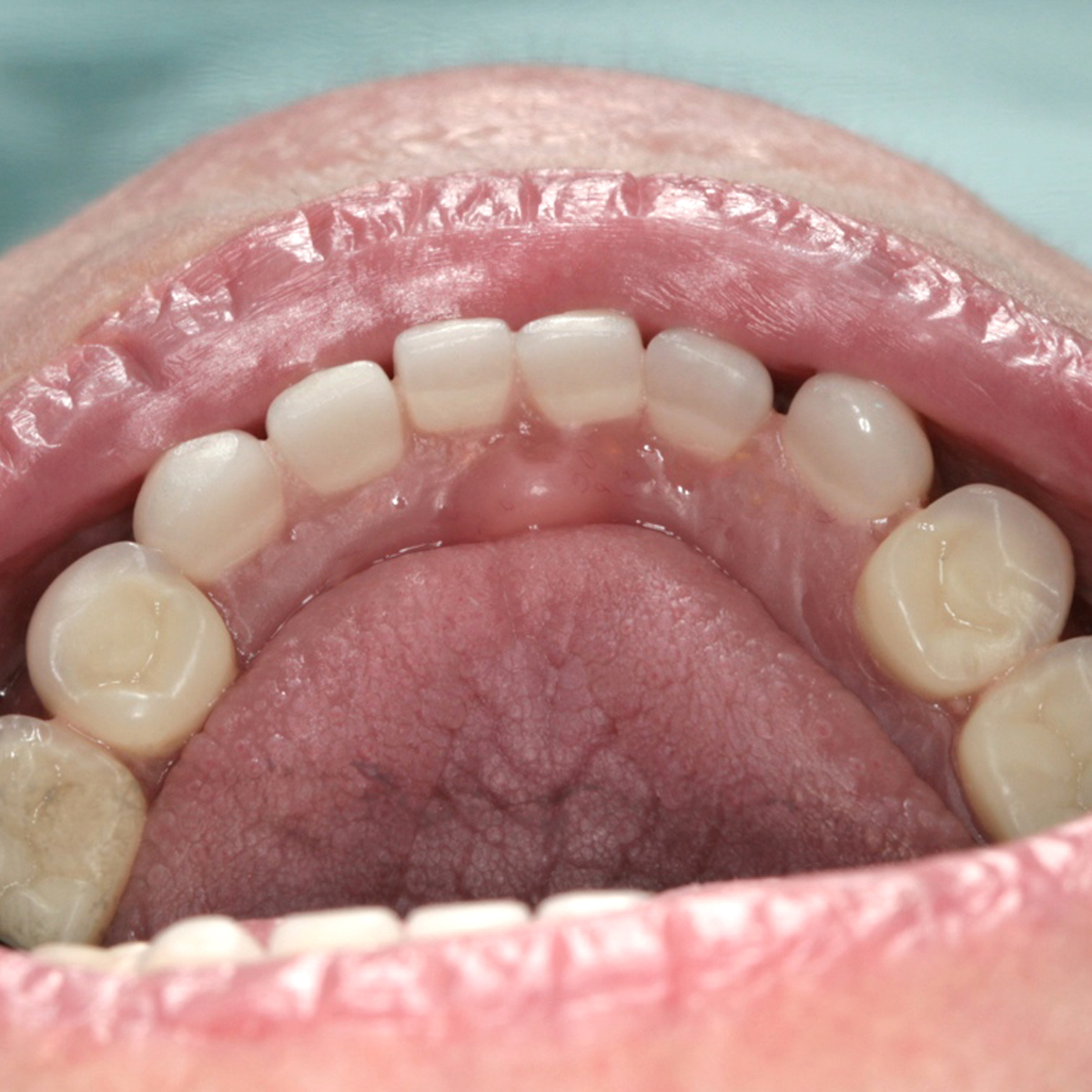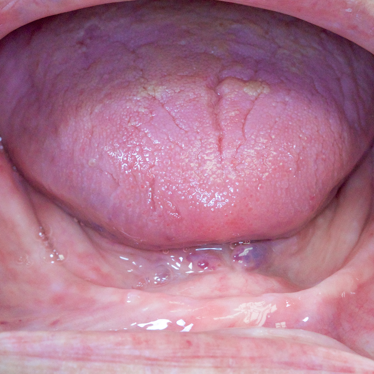 Tongue position is important to maintain stability of the lower denture and develop the proper length of the lingual flange.23 Tongue positions may be classified as “normal” or “retracted” (Figure 12).23 A normally positioned tongue completely fills the floor of the mouth. The lateral borders rest over the posterior edentulous ridges, where they would normally rest over the occlusal surface of the posterior teeth, and the tip of the tongue rests on or is just lingual to the anterior ridge crest. This tongue position maintains the correct position of the floor of the mouth. Retracted tongue posture is demonstrated when the tongue is pulled back, exposing the floor of the mouth, and the lateral borders are either medial to or posterior to the edentulous ridge. In addition, the tip of the tongue is located in the posterior portion of the mouth or is withdrawn into the body of the tongue itself. Approximately 35% of patients present with retracted tongue posture.23 The prognosis of patients with a retracted tongue can be improved by making them aware of their condition and instructing them to position the tongue correctly during rest and function. Prescribing tongue exercises23 and placing a training bead of resin on the lingual aspect of the denture in between the central incisors24 can also help retrain the tongue and maintain its proper position (Figure 13 and Figure 14).