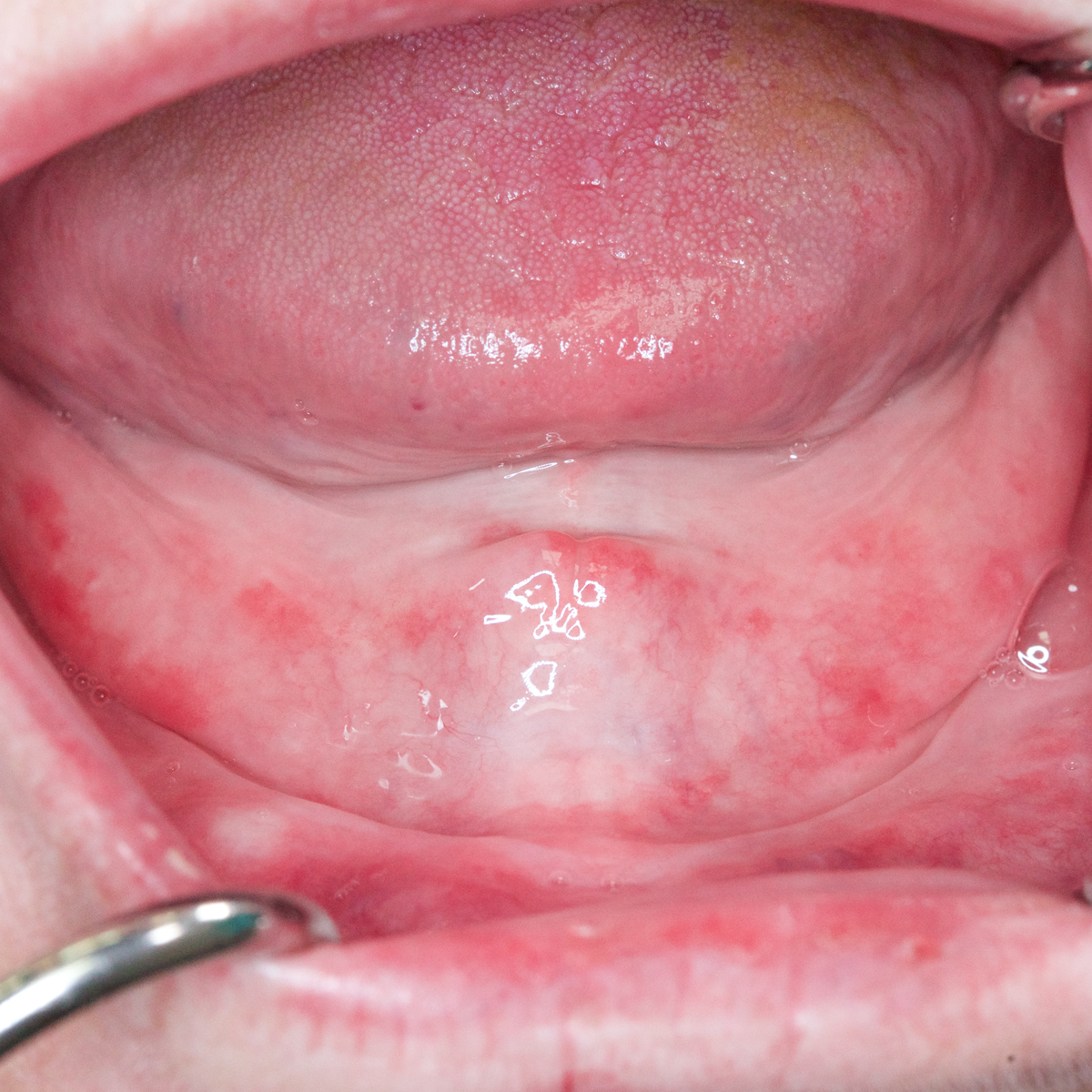 It is critical to assess the nutritional intake and overall physical and mental health of edentulous patients, especially those who are elderly. General health and the health of the denture bearing tissues are greatly impacted by nutritional intake (Figure 15). Some oral lesions may be diagnosed by evaluating the patient's nutritional intake. These can be easily differentiated from those resulting from other causes by a rapid reversion to normal following appropriate dietary and supplement therapy. Poor nutritional intake in an elderly individual may be due to a physiological reason, a mental health issue, or a sequela of an ill-fitting prosthesis.25