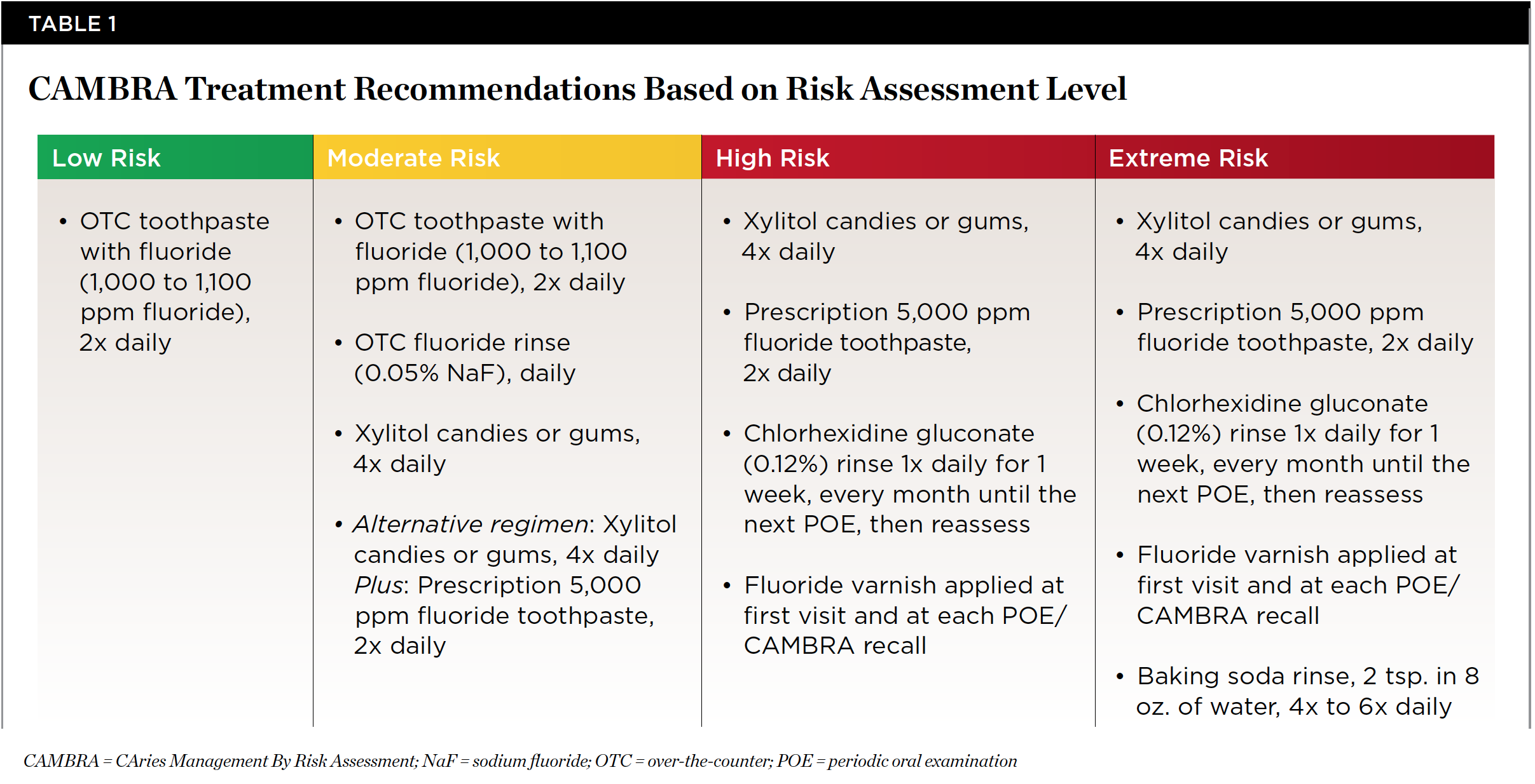 First presented to the dental profession in 2003, the principles of CAries Management By Risk Assessment (CAMBRA®) (University of California San Francisco Office of Innovation, Technology & Alliances Division, ita.ucsf.edu) represented a major change in dealing with caries.4,5 CAMBRA provides clinicians with scientific, evidence-based solutions for the prevention and, consequently, treatment of the disease dental caries.6