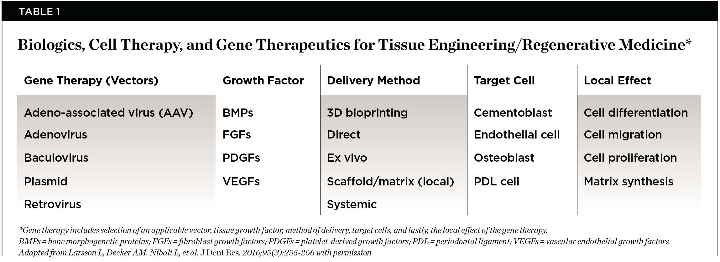 At present, there are several limitations associated with the use of biologics in bone defects to regenerate new tissue. These limitations include short half-life of growth factors, limited control over the release and distribution of the proteins, and possible rapid dilution of the protein concentration due to exposure to the intraoral environment.13 Gene therapy provides an option to deliver a biologic to the site of regeneration for an extended time period using genetically modified cells; this can overcome some of the limitations of the current use of biologics.14