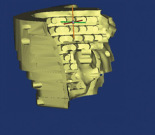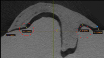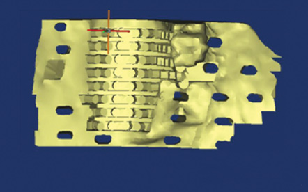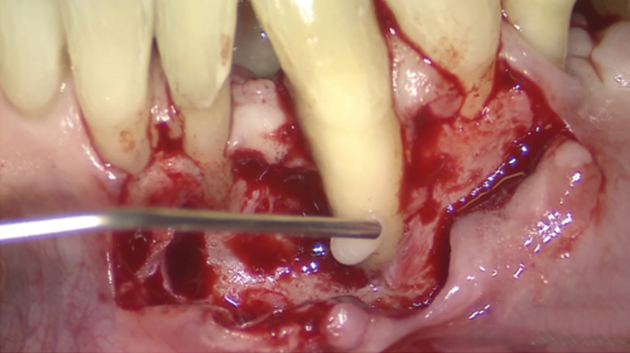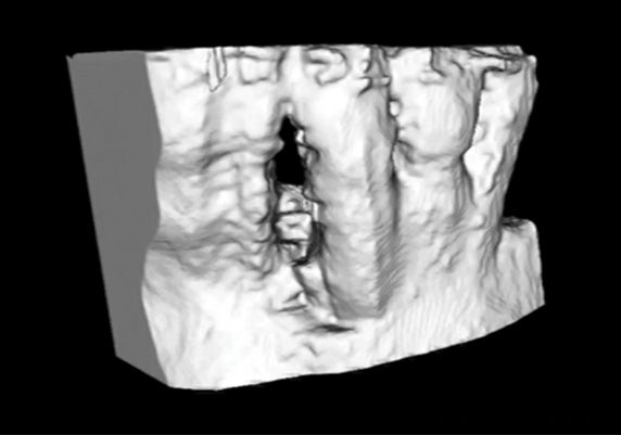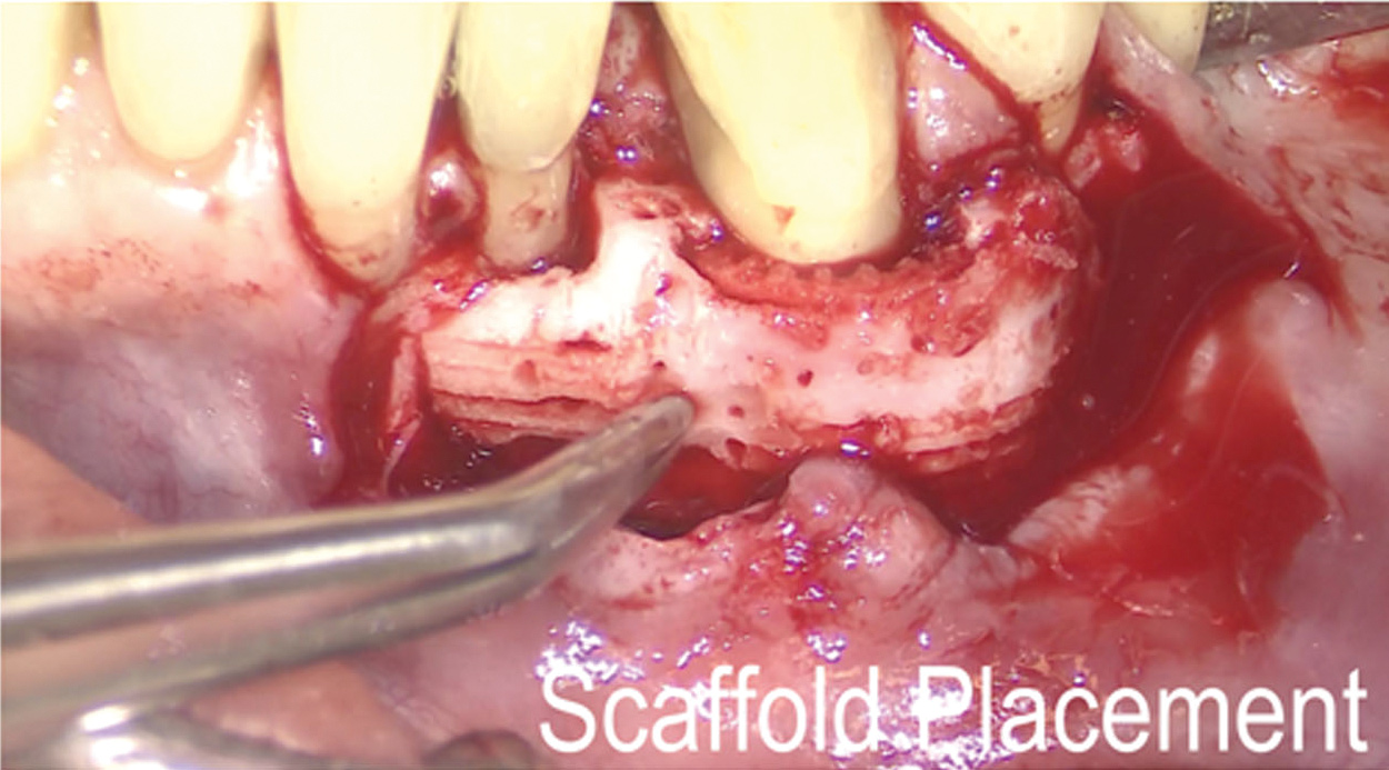 Synthetic polymers such as polycaprolactone (PCL) and poly-L-lactic acid (PLA) can be combined with natural polymers such as hydroxyapatite and β-tricalcium phosphate to allow the formation of biphasic constructs with tailored mechanical properties and rates of degradation. Recently, a first-in-human case report of a custom-designed, 3D-printed PCL scaffold for the treatment of a large periodontal defect was reported in combination with PDGF administration (Figure 3 through Figure 20).23 The scaffold was fabricated using selective laser sintering, which allowed for material powder to be fused together to form a structure based on a CAD file of the scaffold that was designed from CBCT scans of the patient defect. This novel approach offers a promising future application of 3D printing for customized scaffold designs that can be tailored to meet patient-specific needs based on defect site and location, with the added ability to deliver growth factors.