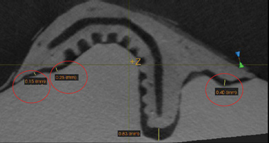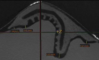 Recently, ixmyelocel-T stem cells were evaluated in a randomized, controlled clinical trial to evaluate sinus floor augmentation with transplantation of autologous cells enriched with stem cells. Ixmyelocel-T is derived from enriched CD90+ and CD14+ bone marrow-derived cell populations and carries a unique expression of markers for tissue repair and regeneration.20 Patients with maxillary sinus bone deficiencies who needed sinus lifting procedures prior to dental implant therapy were allocated to receive either stem cells delivered on a β-tricalcium phosphate scaffold or the scaffold alone. Four months after the surgery, findings from histology and cone-beam computed tomography (CBCT) analyses indicated that stem cell therapy yielded better regenerated bone quality than standard-of-care matrix alone (Figure 1 and Figure 2).20 By targeting specific signaling pathways, oral tissue regenerative outcomes may be improved through delivery of stem cells to increase bone regeneration.