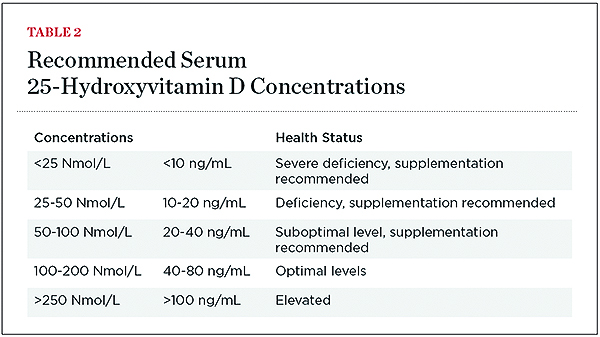 The best indicator of an individual’s vitamin D status is serum concentration of 25(OH)D, because it has a half-life of 15 days. An IOM committee report addresses adequate levels of 25(OH)D.6 A serum concentration of less than 30 nmol/L is designated as a deficiency (Table 2). Ideally, serum concentration of 25(OH)D should be above 50 nmol/L. Certain studies have determined that a level of 80 to 100 nmol/L may be better, and in the near future, this level is likely to be increased.