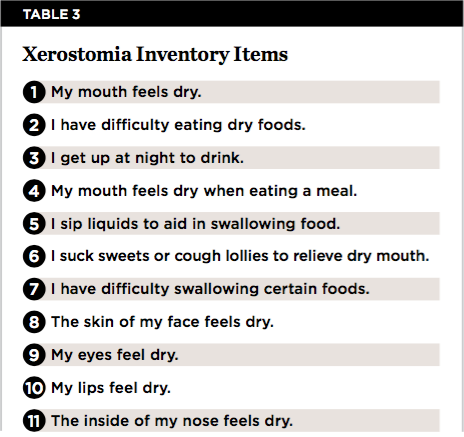 Administering the xerostomia inventory (XI) is a method of capturing and quantifying the impact of subjective alterations associated with dry mouth before and after treatment. The XI inventory includes 11 items (Table 3), and the patient scores each item: (1) Never, (2) Hardly ever, (3) Occasionally, (4) Fairly often, or (5) Very often. A score of 11 indicates mild xerostomia, while a score of 55 signifies severe xerostomia. A change of six or more points in the score indicates clinical significance of the treatment intervention.16,17 Several questions can be asked of the patient that have been reported to identify individuals with salivary gland hypofunction, even if they do not report feeling dry. These include: Does the amount of saliva in your mouth feel to be too little? Does your mouth feel dry when eating a meal? Do you sip liquids to aid in swallowing dry food? Do you have difficulty swallowing?18