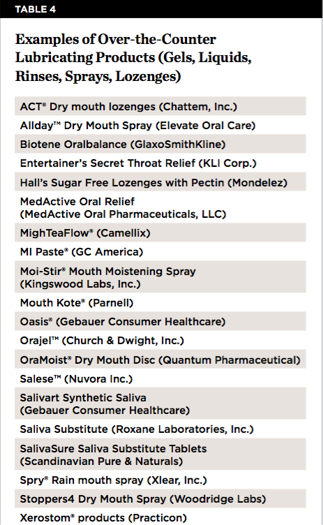 Because salivary stimulant medications do not restore physiologic function, patients on salivary stimulant medication may find they need additional lubrication for speaking at length or comfort. A wide variety of lubricants are available over the counter (Table 4). Patients can be encouraged to try new products to find those that work best for them. Rinsing frequently with salt water or salt water (1/2 teaspoon) and bicarbonate of sodium (1/2 teaspoon) in 8 ounces of water can be cleansing and increase comfort by neutralizing acids and removing debris. A drop of mineral oil or glycerine placed on the tongue can be spread on the oral mucosa to improve comfort. Other suggestions for patient self-care include drinking more water; chewing sugar-free gum; tooth brushing and flossing twice daily; having regular dental care; avoiding tobacco, which is drying; and avoiding caffeine and alcohol, both of which are dehydrating.
