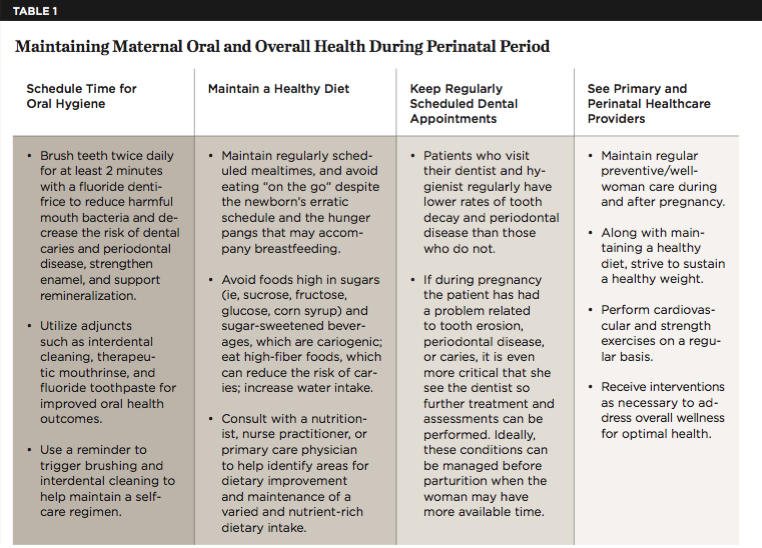 Additionally, assessment of pregnancy-influenced gingival conditions, such as pregnancy gingivitis and pyogenic granuloma, and their postpartum resolution should be undertaken during the postpartum and infancy period. Non-emergent dental care that may have been deferred during the pregnancy should be completed at this time to ensure that oral health is maintained and dental disease does not worsen due to neglect. New mothers should be encouraged to facilitate childcare to allow for adequate time for these critical appointments so they may receive their needed and routine care. Maternal oral and overall health is critical during the perinatal period when sleep deprivation, hormonal changes, and caring for an infant may hinder the mother's personal emphasis on self-care. Table 1 offers suggestions for the maintenance of maternal oral and overall health during the perinatal period.