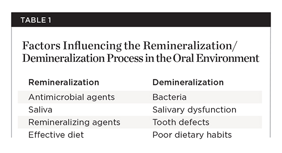 Dental caries are a pathological condition that results from an imbalance in the physiological process of remineralization/demineralization of the dental structure.1 Remineralization plays an important role by preventing the progression of the disease and reversing initial signs of demineralization (Table 1).2-4 If the demineralization process continues, cavitation will eventually result. Because of the presence of calcium and phosphate ions in a supersaturated state, human saliva has the potential to remineralize tooth structure.1 Caries can be arrested or even reversed at the pre-cavitated stage, provided a balance towards remineralization can be established.