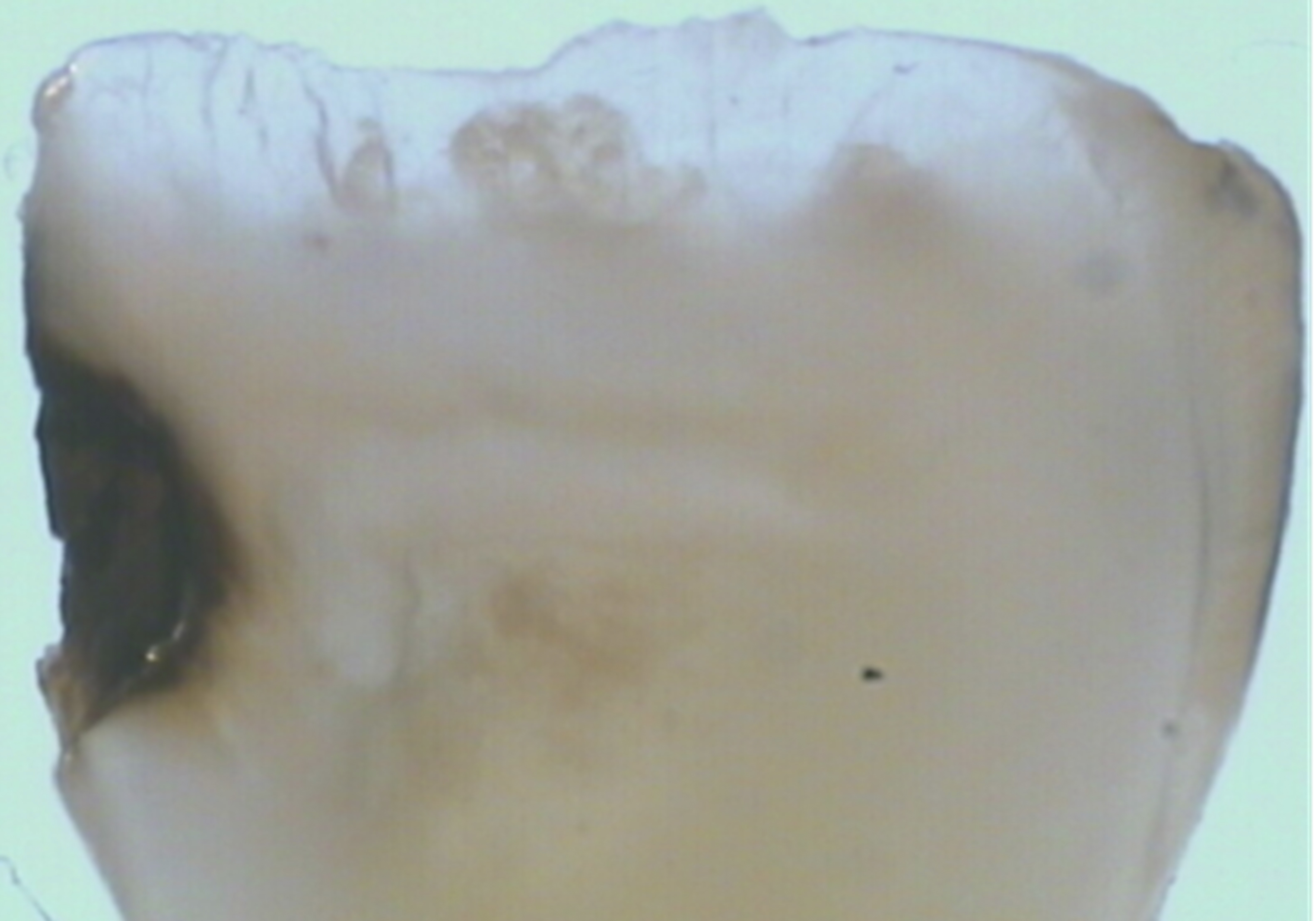 There are several advantages of using SDF in dental treatment. First, it showed an antimicrobial activity against mono-species, dual-species, and multi-species cariogenic biofilm.14-16 Silver ions are bactericidal metal cations that inhibit biofilm formation.17 Studies have indicated that silver interacts with sulfhydryl groups of proteins and DNA, thus altering hydrogen bonding and inhibiting respiratory processes, DNA unwinding, cell-wall synthesis, and cell division.18 At the macro level, these interactions affect bacterial killing and inhibit biofilm formation.17 Second, fluoride promotes caries lesion remineralization. Fluoride has been indicated to react with hydroxyapatite and generate calcium fluoride, which is a reservoir of fluoride, and facilitate further remineralization.19 An ex vivo study reported surface microhardness of the surface layer of the arrested caries after SDF applications was comparable with the unaffected sound dentin20 (Figure 1 and Figure 2). This is consistent with another study, in which a high remineralized zone was observed on the surface of arrested caries from exfoliated teeth with SDF treatment21 (Figure 3 and Figure 4). Third, its application procedures are simple and do not require injection or drilling, and the treatment does not involve expensive support infrastructure equipment such as piped water and electricity. The simplicity of the treatment is conducive to treating caries in apprehensive young children who may have intense dental fear, uncooperative patients with special needs, or elderly patients who have difficulty adapting to traditional dental care. It also allows trained workers to deliver the treatment to people who live in the area but who may not be able to easily access dental service.22 Patient compliance and satisfaction is often good when the patient is provided a clear explanation of the treatment outcome.23,24 Finally, the cost of SDF treatment is low and should be affordable in most communities.