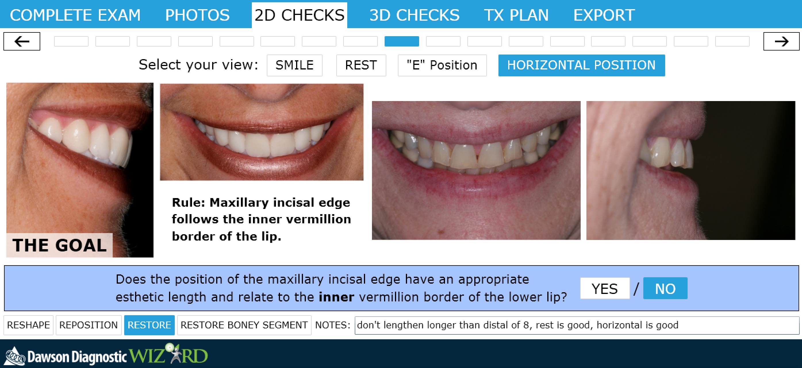 The “tip-down” smile and 90º positions are used to evaluate the horizontal position of the maxillary incisal edge. This edge should have a trajectory toward the inner vermillion border (wet/dry line) of the lower lip.