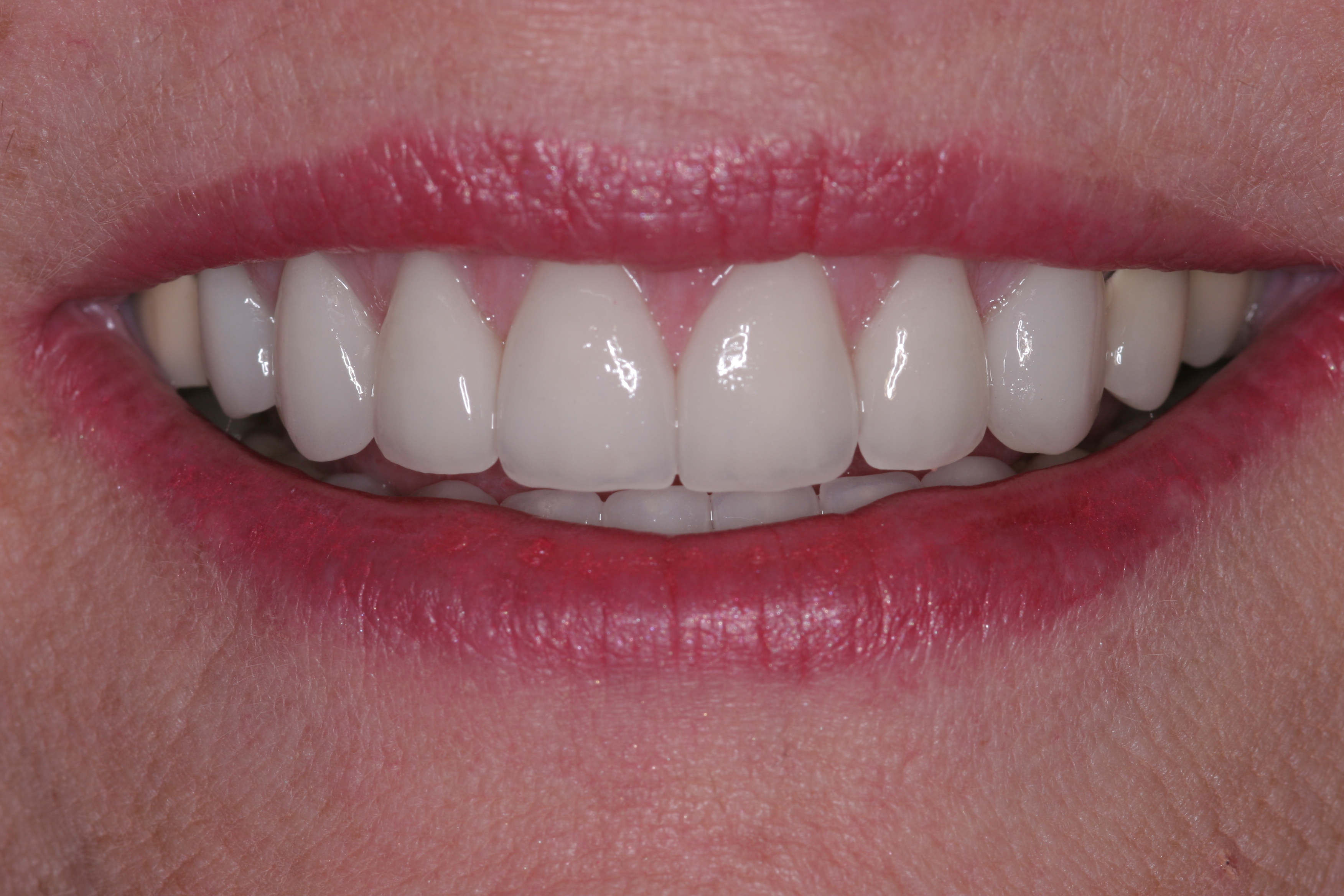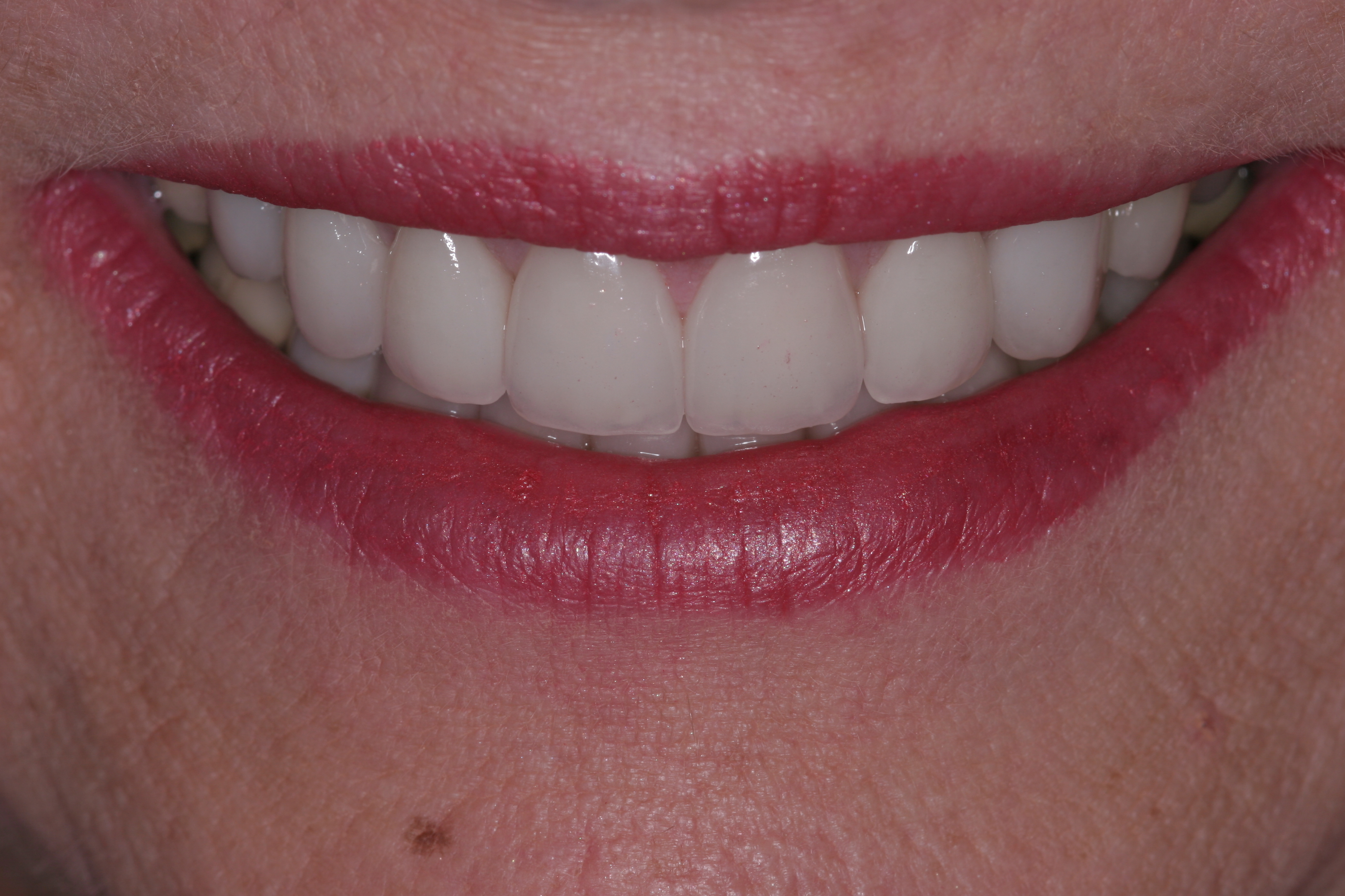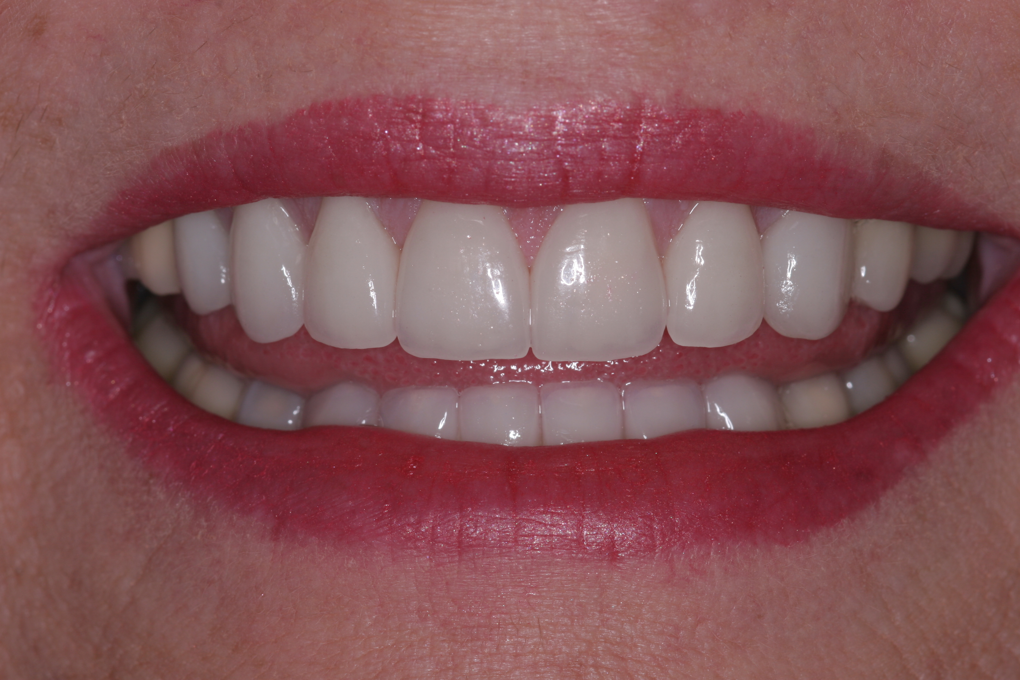 Treatment for this patient included posterior reductive equilibration and additive anterior equilibration (restoration) to eliminate the CR/MIP interferences and to meet the requirements of occlusal stability. Teeth Nos. 5 through 11 and 22 through 27 were prepared for full-coverage lithium-disilicate restorations. Crestal bone heights were evaluated. Soft-tissue crown lengthening was performed on the maxillary anterior teeth by a soft-tissue diode as needed. The esthetic, functional, and phonetic changes were evaluated and confirmed in the provisional restorative phase (Figure 17 through Figure 21).