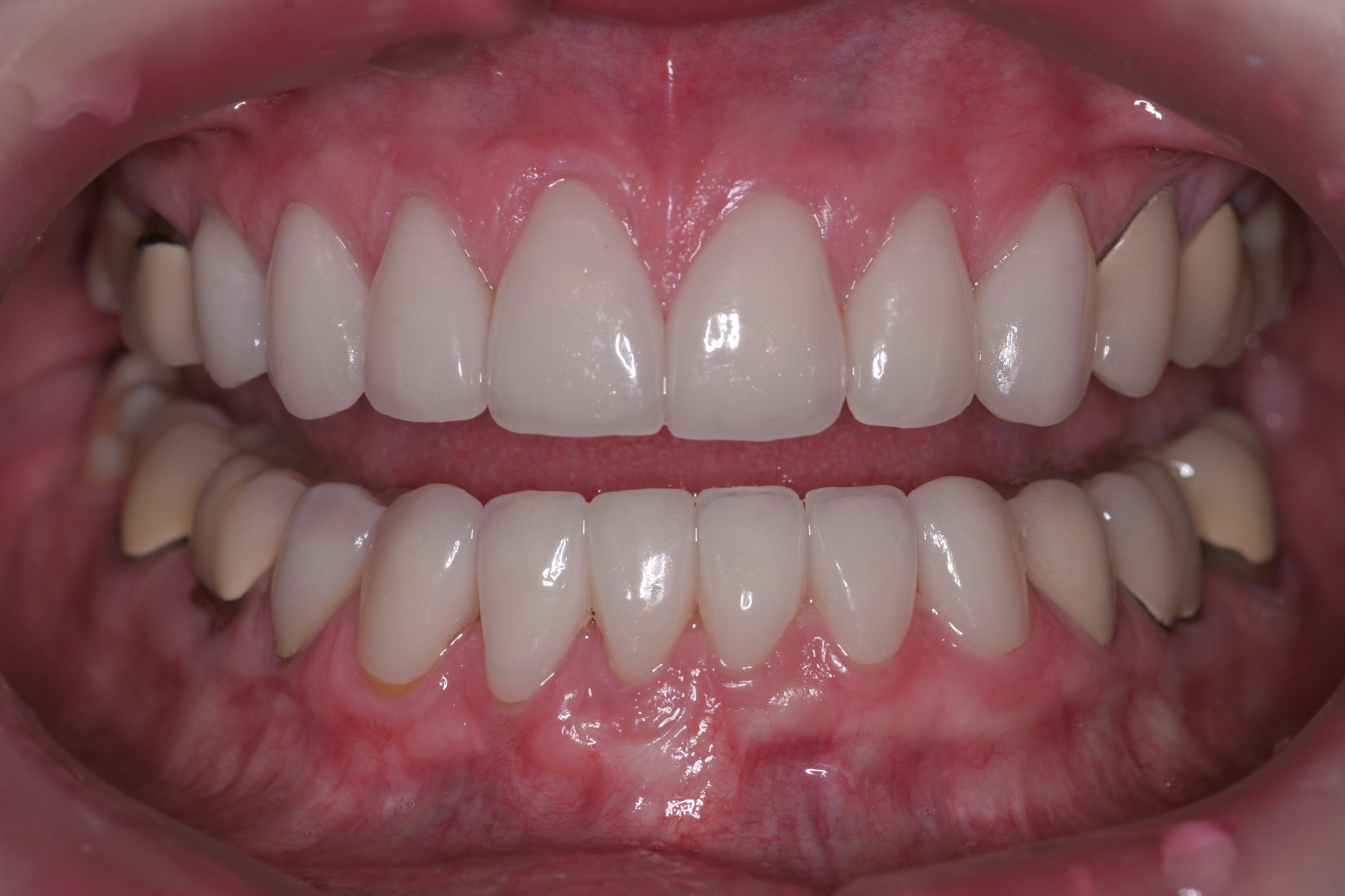 Once approved, impressions of the provisionals were taken so the laboratory could precisely copy the 3D position of the anterior teeth as successfully proven in the provisionals. The postoperative result and final functional photographs are shown in Figure 22 through Figure 29. Posterior treatment can now be completed in segments as necessary. Posterior morphology will be developed in harmony with the now corrected anterior contour and functional parameters. The fulfillment of the previously mentioned requirements of occlusal stability were evaluated and refined in the final restorations. The patient was placed in a posttreatment dual-arch B splint appliance to help manage any further parafunctional forces should they occur.