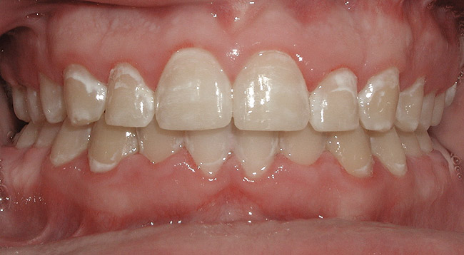 Figure 6 Post-orthodontic white-spot lesions in a patient with poor oral hygiene.
