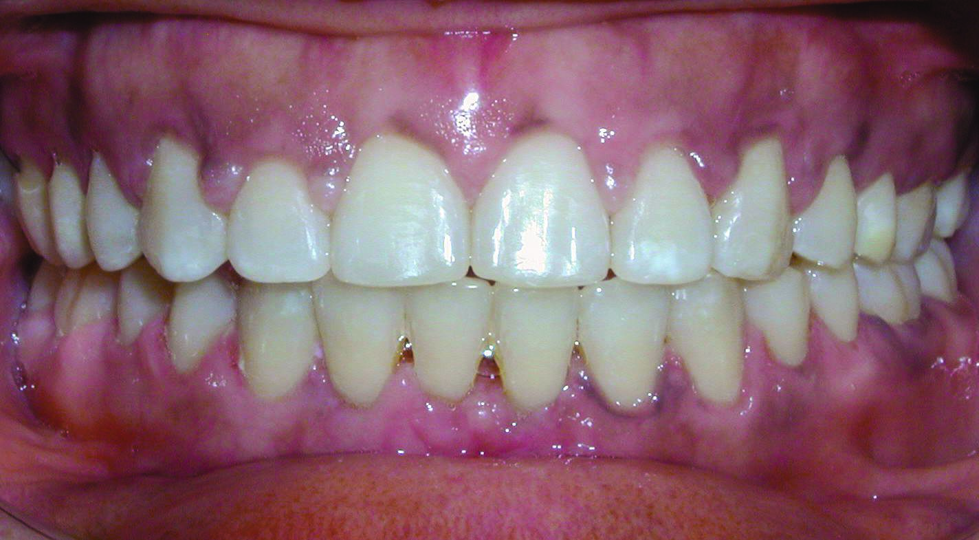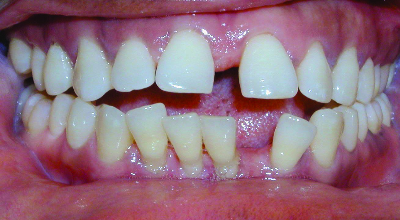 Figure 3 “Before” photograph of an adult patient with significant periodontal disease and recession with some teeth that historically might have been considered “hopeless.”