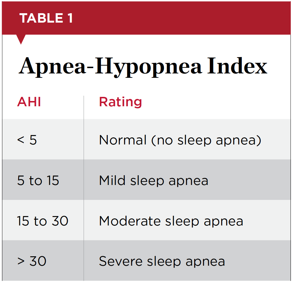 SRBDs are characterized by sleep-disordered breathing that results from the repeated collapse or restriction of the pharyngeal airway during sleep due to structural and functional abnormalities.2 SRBDs are diagnosed through an overnight polysomnogram or a home sleep test and measured using the Apnea-Hypopnea Index (AHI) (Table 1), which associates the number of apneic and hypopneic events per hour with severity.
