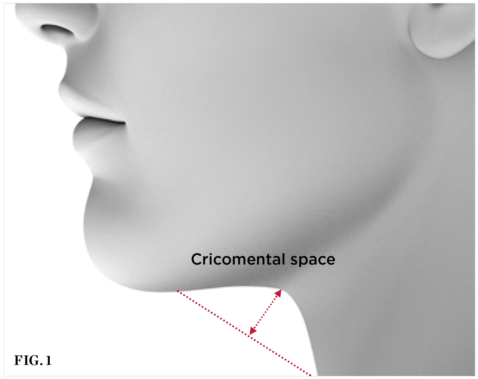 Identifying a potential lack of cricomental space is easily done through visual assessment. Measurement can also be completed using a ruler or small tape measure. First, while the patient holds his or her head in a neutral position, find the cricomental distance by measuring between the cricoid cartilage and the inner chin. Then, bisect the cricomental distance and measure the perpendicular distance to the skin (Figure 1). If the patient's cricomental space is greater than 1.5 cm, his or her risk of developing an SRBD is very low. If the cricomental space is less than 1.5 cm, then other factors such as increased age, larger- or smaller-than-normal neck circumference, increased weight, overbite, and high pharyngeal grade should also be assessed; the more of these factors that are present, the higher the patient's risk of developing an SRBD.10