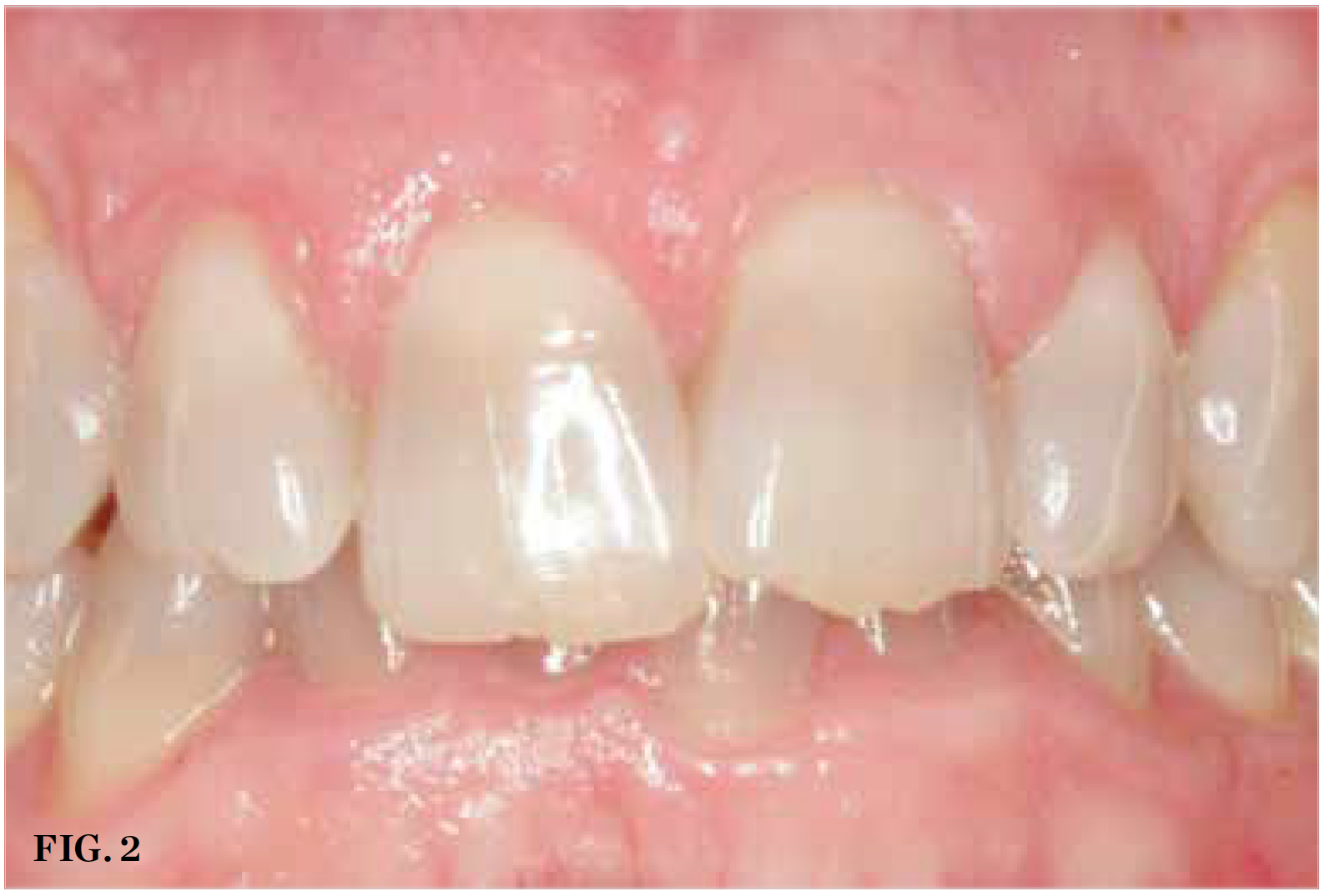 In orthodontics, a patient is considered to have an overbite when 50% or 4 mm of the lower incisors are covered when the patient bites down. Another good screening tool to determine a patient's bite is the Shimbashi measurement. The Shimbashi measurement refers to the distance between the cementoenamel junction of the central upper incisors and the cementoenamel junction of the central lower incisors, which should amount to 17 mm to 18 mm.13 Patients with a Shimbashi number that is significantly less than 18 mm are likely to have their lower front teeth nearly completely covered by their upper teeth. Such patients are much more prone to developing sleep-disordered breathing as a result of their uneven bites (Figure 2).