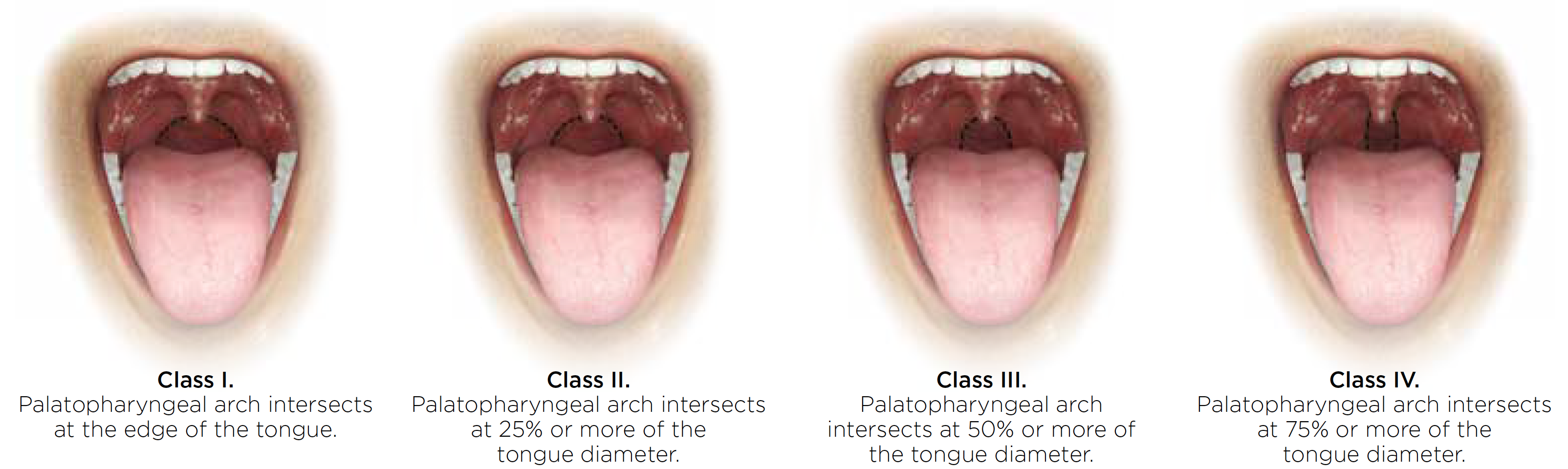 The pharyngeal grading system categorizes the amount of pharyngeal space that is visible or obscured by the tissues in the back of the throat using the following classes14 (Figure 3):