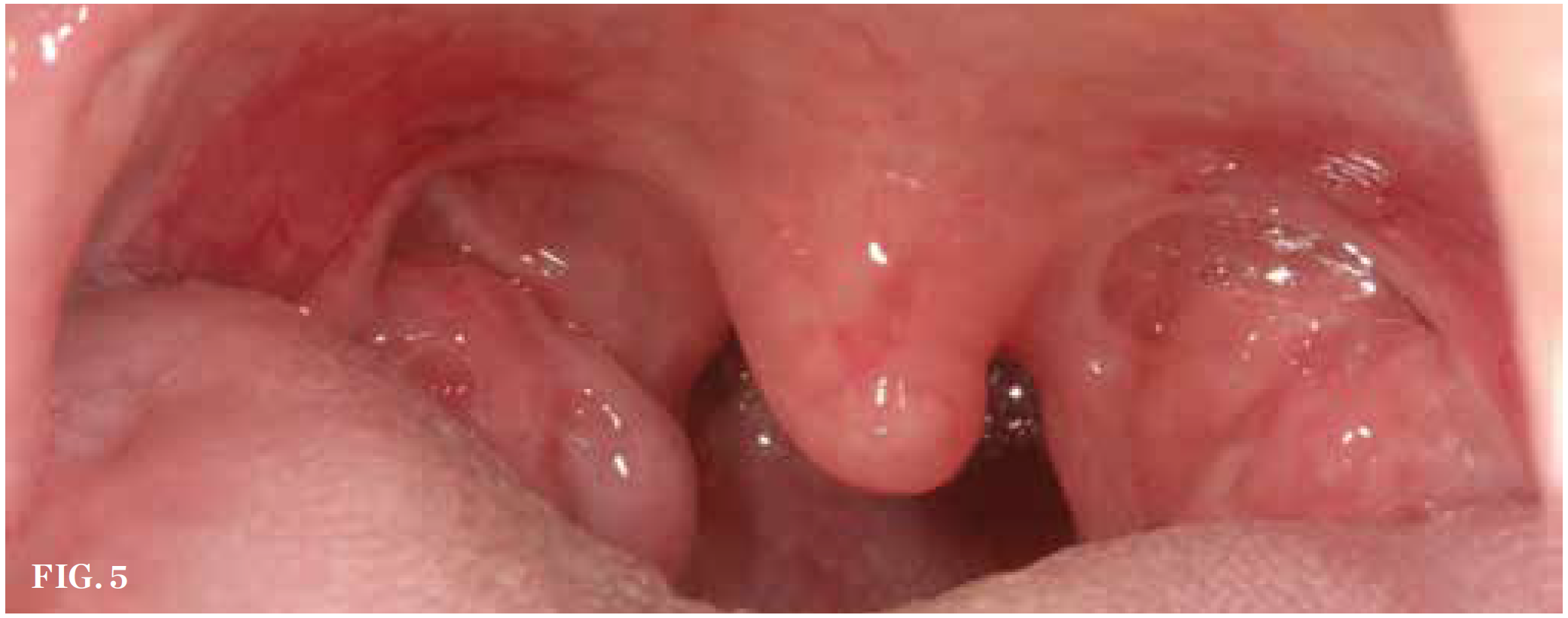 Patients with a tonsil grade of 3 or 4, whose tonsils protrude past the posterior pillars (Figure 5) or are so large that they are almost vaulted in the middle, are at the greatest risk for the development of sleep-disordered breathing.