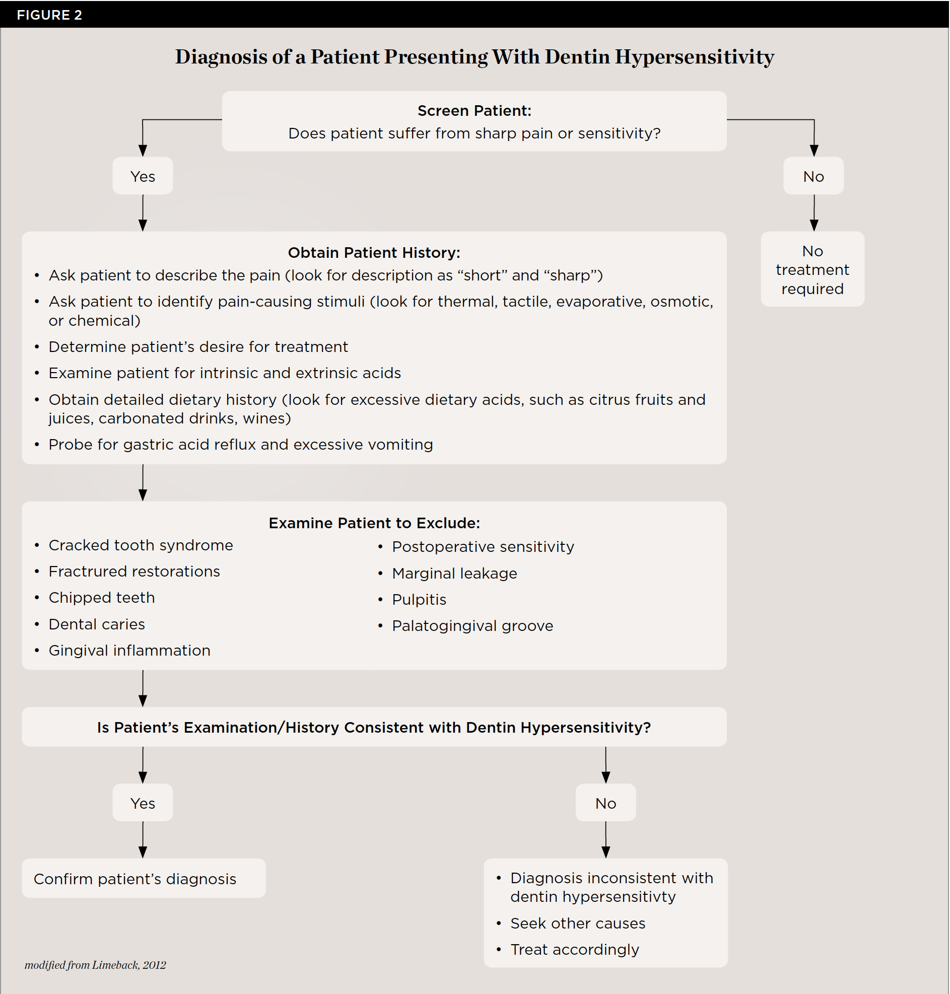 The dental pain experienced with dentin hypersensitivity is often sharp in character and short in duration. However, the response to stimuli varies from patient to patient. Factors such as individual pain tolerance, emotional state, and environment (eg, certain workplaces like a battery manufacturing facility, where employees may be exposed to sufuric acid mist that can be a cause of dental erosion and subsequent dentin sensitivity) can contribute to the variety of responses among patients.16 If the patient's history and examination is consistent with dentin hypersensitivity and the diagnosis has been confirmed, the patient may be treated accordingly. The steps a dental professional should take to diagnose a patient with dentin hypersensitivity are outlined in Figure 2.17