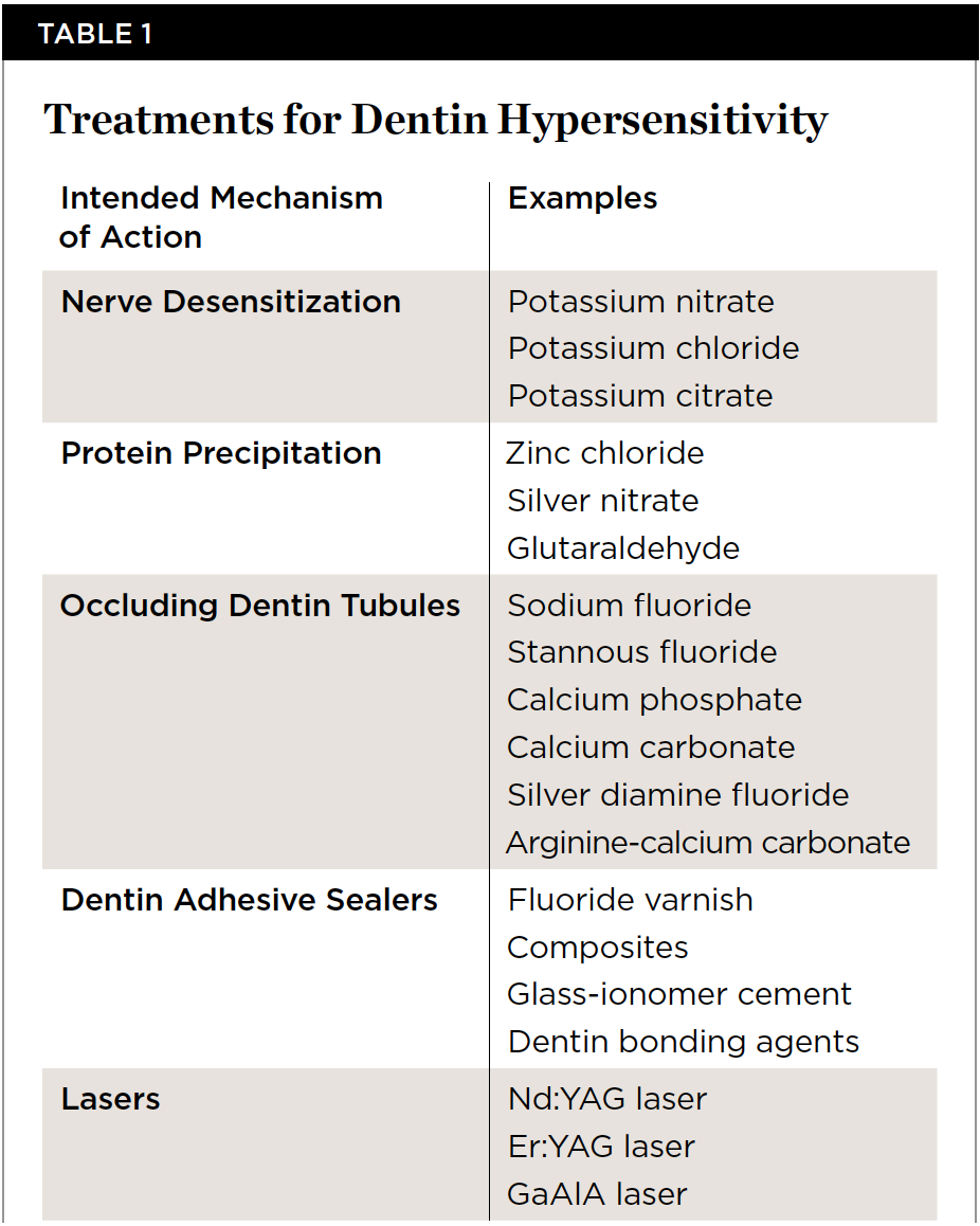 An ideal desensitizing agent should provide rapid action with long-term effects; be non-irritating to the pulp, painless, and simple to apply; and not cause staining on the teeth.19 The two different purported mechanisms of action include occlusion of dentin tubules by use of a mechanical barrier or stimulation of peritubular or reactive dentin (eg, resins, varnishes, toothpastes) or stabilization of nerve fibers, which interferes with the transmission of nerve impulses.19-21 Examples of treatments for patients experiencing dentin hypersensitivity are listed in Table 1.