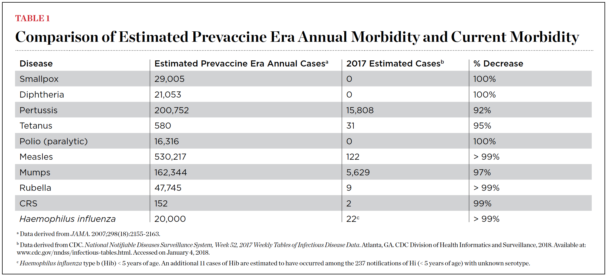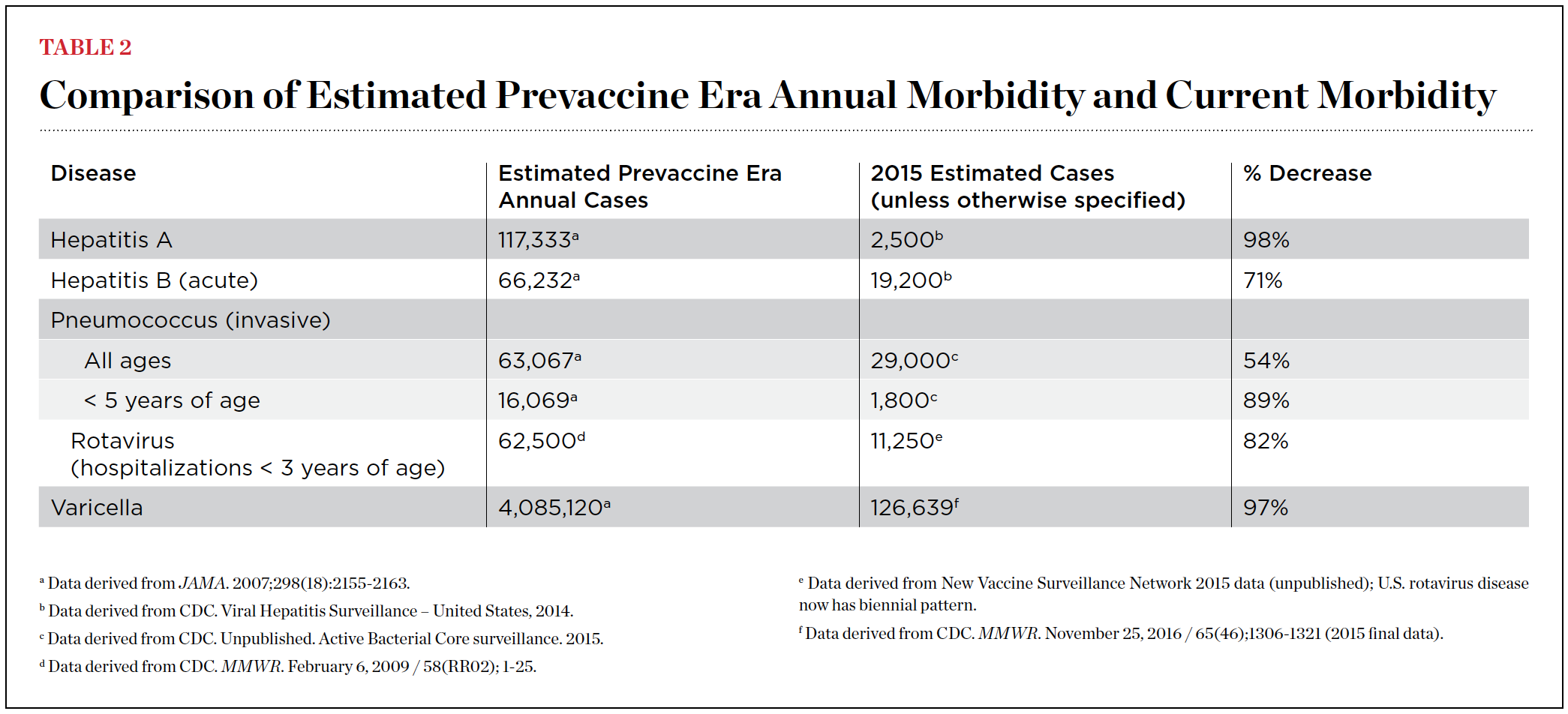 Successful vaccination resulting in the reduction of a variety of bacterial and viral diseases is recognized as one of the top public health achievements of the 20th century.1 This success has continued into the 21st century with the introduction of later-generation vaccines that protect against shingles, human papillomavirus (HPV), pneumococcal pneumonia, meningococcal disease, and pertussis. As a result, the implementation of routine immunization protocols for children and adults has led to documented, dramatic reductions in the incidence of vaccine-preventable diseases in the United States (Table 1 and Table 2).2,3 On a cautionary note, however, although the incidence of many vaccine-preventable diseases has been sharply reduced by childhood vaccination, they have not been eliminated.