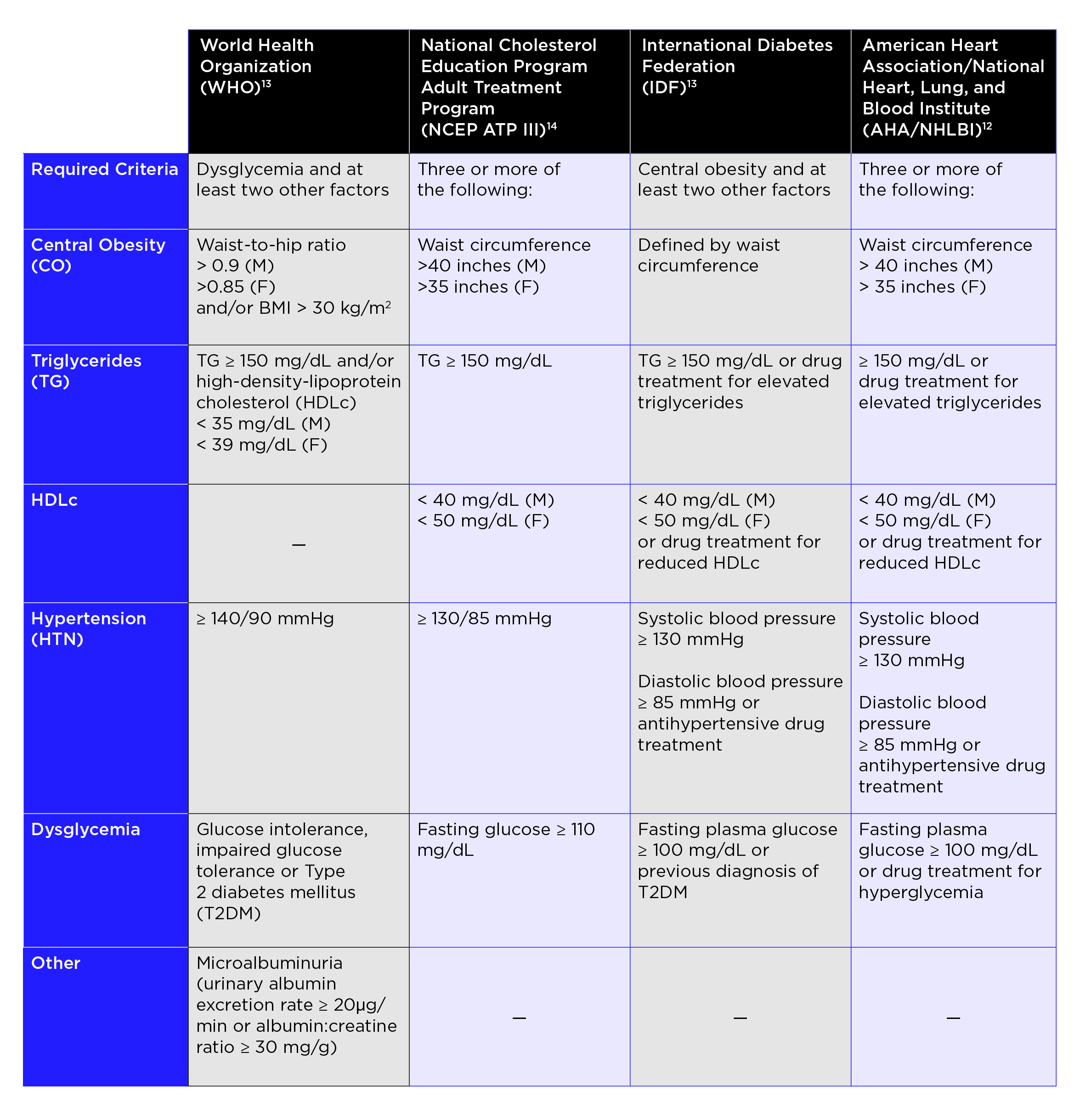While the current definition of clinical MetS differs based upon diagnostic criteria,12-14abdominal obesity, hypertension, and hyperglycemia are the most common components. Severity of MetS and frequency of the secondary sequelae (eg, CVD, T2DM, and cerebrovascular diseases) appear to be related to the involvement and severity of MetS components.10 It has been demonstrated that the presence of three MetS components increases the risk of development of CVD by 2.7-fold and the presence of four or more MetS components increases the risk of CVD 5.9-fold. The incidence of T2DM appears to be tied to MetS components in an even more robust fashion with a 10-fold increase in T2DM seen in individuals with 3 MetS components and a 35-fold increase in T2DM seen in individuals with 4 or more MetS components.15 Table 1 describes commonly used diagnostic criteria for MetS.