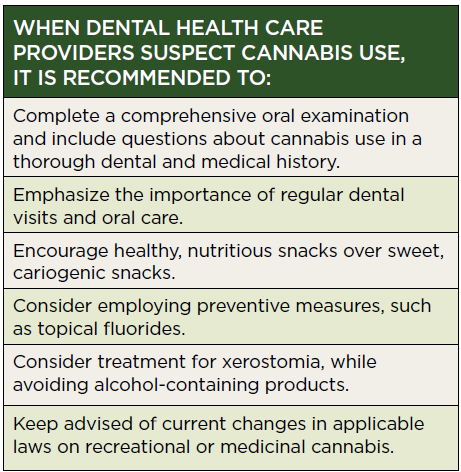 With the growing use of cannabis and cannabis derivatives nationwide, dental professionals may treat higher numbers of patients with a history of cannabis use and those who may report side effects of cannabis use, including effects on the oral cavity. A thorough understanding of the impacts of cannabis on oral and overall health as well as continued assessment of current state law changes related to cannabis consumption are critical to allow the dental healthcare team to provide safe and effective treatment to all patients.