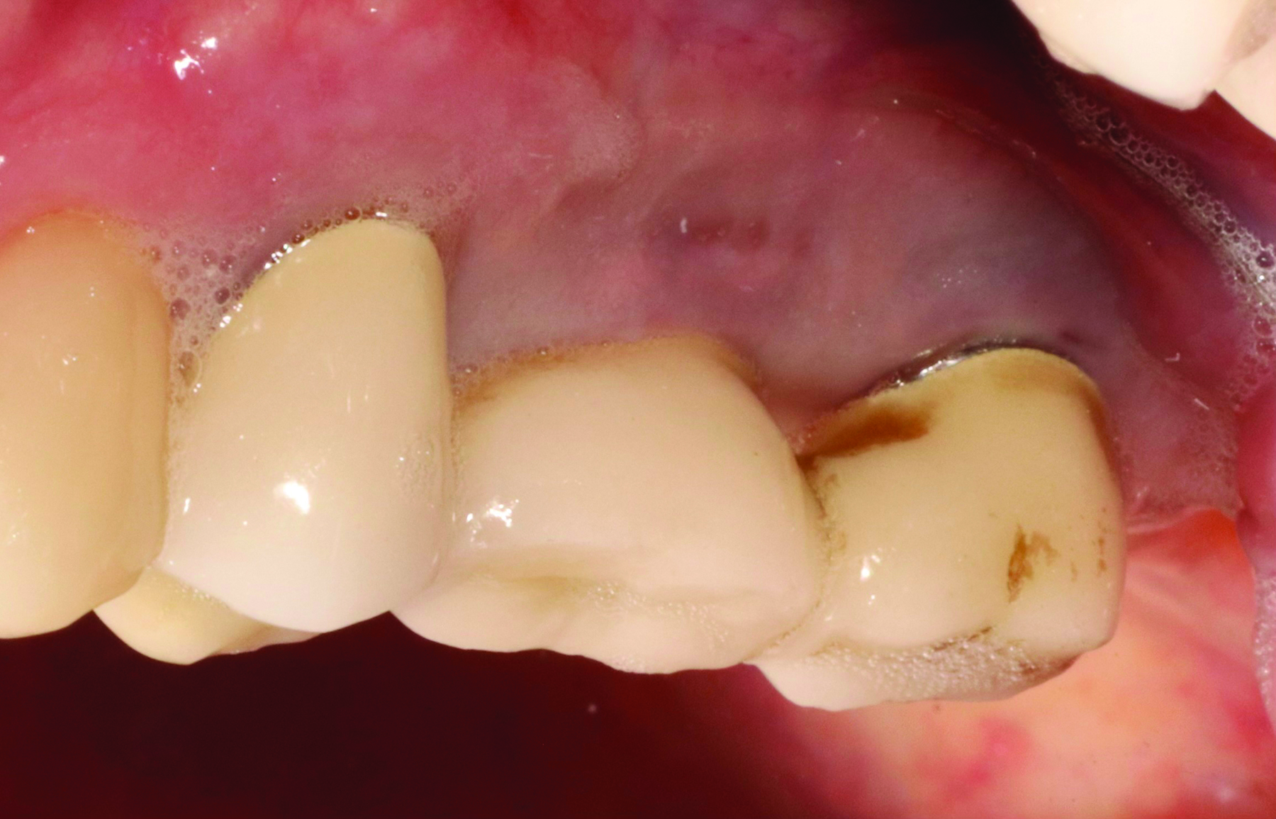 Peri-implant mucositis, which is the precursor to peri-implantitis, develops after accumulation of bacterial biofilm on the implant surface, leading to an inflammatory reaction in adjacent soft tissue without loss of the supporting alveolar bone yet.21 Similar to periodontal disease, optimal plaque control and supportive therapy is vital to the prevention and subsequent maintenance of peri-implant disease. While peri-implant mucositis is reversible, if left untreated it may progress to peri-implantitis.