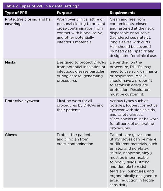 Personal Protection Equipment (PPE) is used to shield the mucous membranes, respiratory tract, skin, and clothing from direct contact with infectious pathogens.3 Appropriate PPE for different types of patient interactions must be available. It should effectively cover personal clothing and skin, likely to be soiled with blood, saliva, or other potentially infectious materials.11