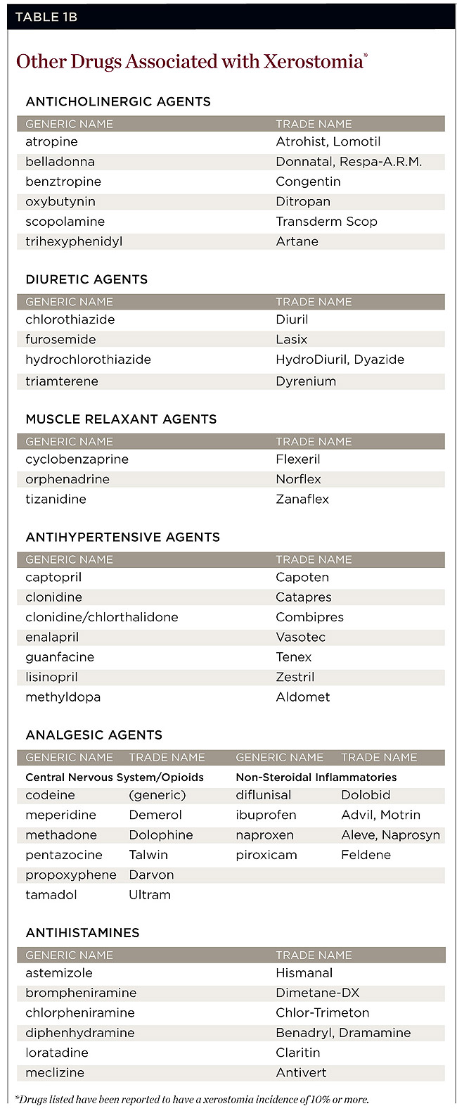 Saliva plays a central role in the formation of oral malodor. One of the functions of saliva is to purge any remaining food debris from the oral cavity. Periodontal pockets can cause food debris to accumulate and the rate of foul-odor production to increase.2 Some medications may cause xerostomia and result in oral malodor, especially those with anticholinergic activity. Such medications include antihistamines (eg, astemizole, brompheniramine), tricyclic antidepressants (eg, amitriptyline, desipramine), diuretics (eg, chlorothiazide, furosemide), antihypertensives (eg, captopril, clonidine), and analgesics (eg, codeine, meperidine) (Table 1A and Table 1B).3 Sympatholytics also can cause xerostomia. They include α-blockers (eg, terazosin), α-2 agonists (eg, clonidine), and ß-blockers (eg, metoprolol).4 Oxazepam, which is a muscle relaxant and sedative, has side effects that include xerostomia; however, this is temporary.5