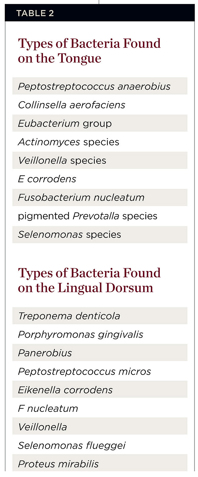 In a study by Tyrell et al,9 tongue samples were cultured and numerous bacterial species isolated. Among those isolated, the most common were Peptostreptococcus anaerobius, Collinsella aerofaciens, Eubacterium group, Actinomyces species, Eikenella corrodens, Veillonella species, Fusobacterium nucleatum, pigmented Prevotella species, and Selenomonas species. Other bacteria frequently found on the lingual dorsum were Treponema denticola, Porphyromonas gingivalis, Peptostreptococcus micros, Actinomyces israelli, Selenomonas flueggei, and Proteus mirabilis (Table 2). Tongue cleaning improves taste sensation and seems to reduce the substrata for putrefaction, rather than the bacterial load.10 The tongue coating consists of blood components, nutrients, epithelial cells, and bacteria. The amount of VSCs on the tongue is correlated with the amount of tongue coating. In addition to the VSCs, the presence of tongue coating may be related to the level of secretory immunoglobulin A (IgA) in the saliva. In patients who have only slight tongue coating, the concentration of secretory IgA was found to be higher than in patients with moderate-to-heavy coating. Combined with findings on Streptococcus species, secretory IgA may act as shielded protection against tongue plaque.11