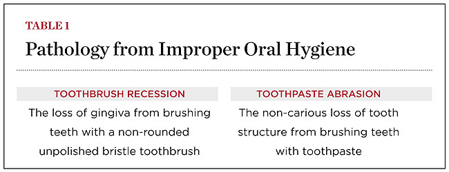A distinction between the terms toothbrush abrasion and toothpaste abuse needs to be made, which will hopefully cause a paradigm shift in thinking and a better understanding about the pathological dynamics of the dento-gingivo-cervical junction. The non-rounded, unpolished bristle toothbrush, regardless of degree of stiffness, can damage gingiva (recession).21,22 Toothpaste can damage teeth (NCLTS) regardless of the type of brush.13-15,23-25 Because the deleterious effects of the toothbrush and toothpaste are two separate issues, ie, one can harm soft tissue and the other hard tissue, the all-inclusive term "toothbrush abrasion" is clinically inadequate and misleading. Therefore, the introduction of two new terms is essential: toothbrush recession and toothpaste abrasion (Table 1).