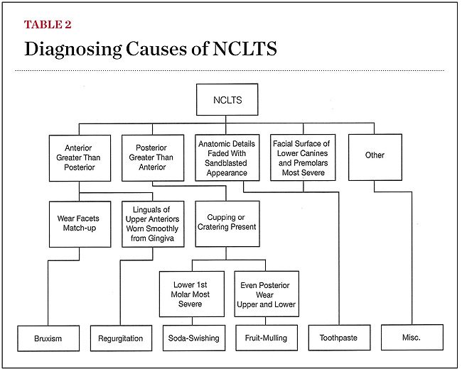 The pathognomonic patterns of NCLTS are collectively based on the quantity, position, and juxtaposition of all the teeth in an entire arch and the relationship of both arches to each other that is consistently specific to the cause. The effective loss of tooth structure will vary quantitatively and positionally with the time, pressure, and speed of motion of the abrasive or the acid on each individual tooth. When this is consistently repeated without variation, a pathognomonic pattern is established. By observing the quantity and positional NCLTS on accurate dental casts, the dental practitioner will discover these patterns and be able to precisely identify the various causes of this ever-increasing problem. Table 2 is a flowchart designed to expedite the diagnostic process for the etiology of NCLTS. To be successful in the treatment of any disease or disorder, one must be able to determine the cause before a cure is possible. The success of the restoration of NCLTS is dependent on this axiom. The clinical value of this author's discoveries should be obvious.