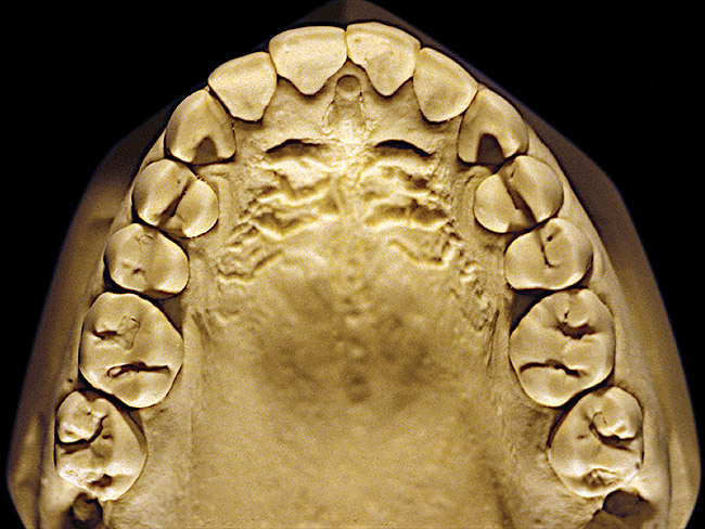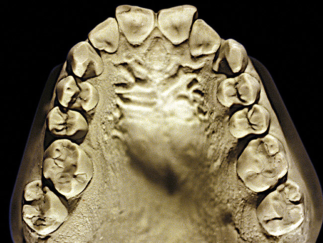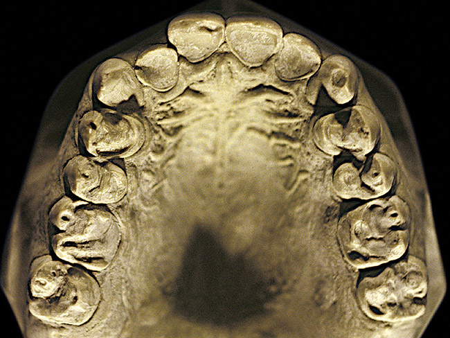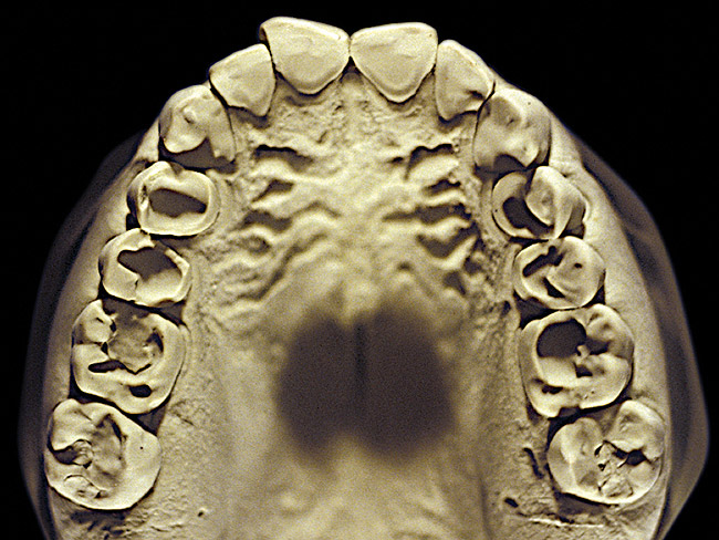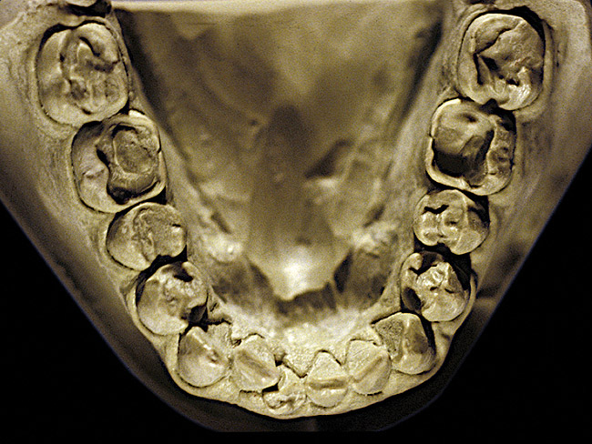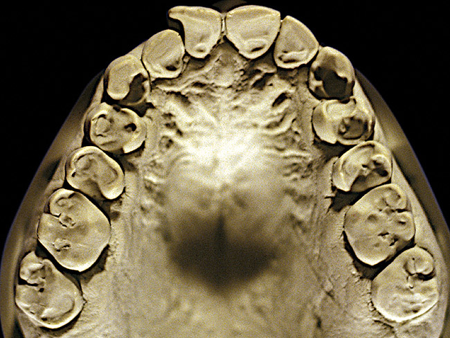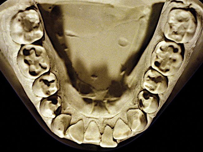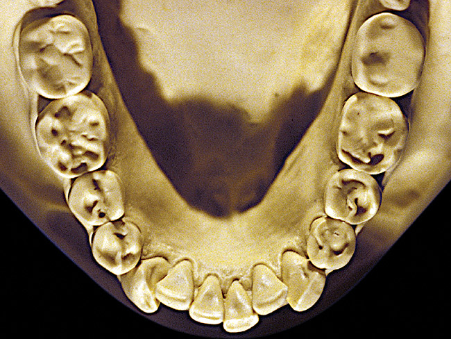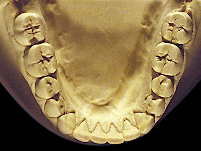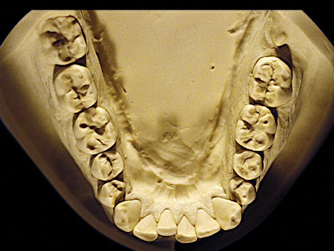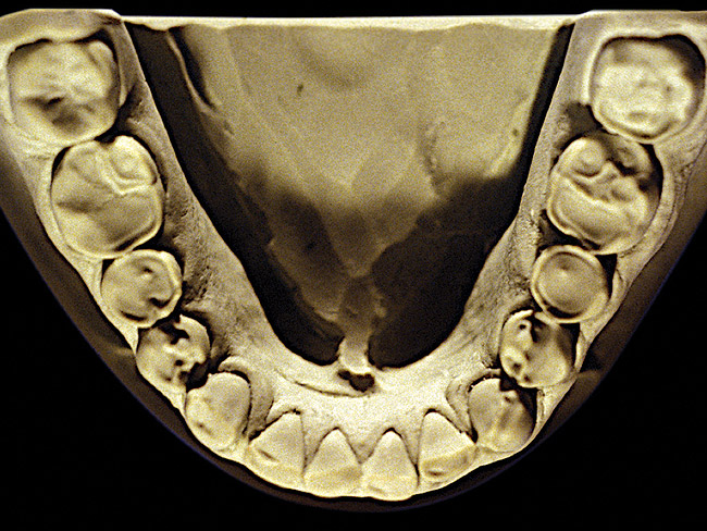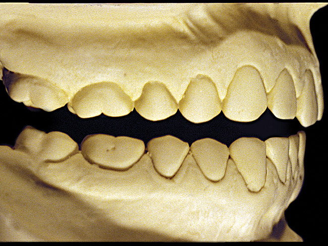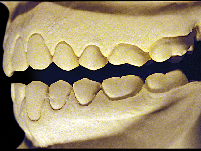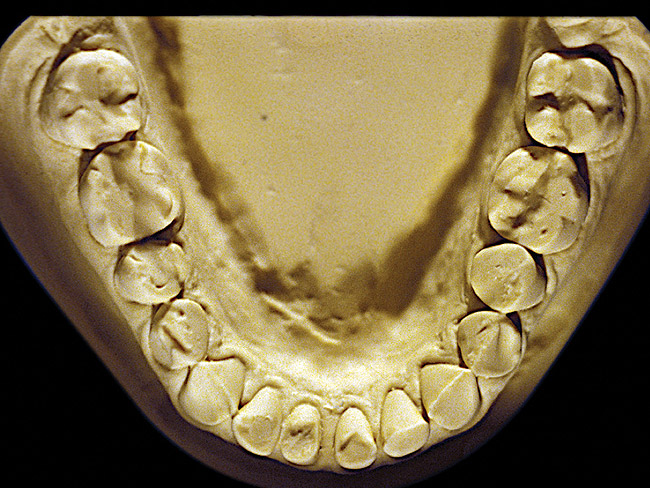So that the previous example is not misleading, the behavioral profile of the toothpaste abuser is not necessarily the "caries-free immaculate oral hygiene patient," but can be virtually anyone who brushes their teeth with toothpaste. Figure 11 and Figure 12 illustrate a more advanced example of toothpaste abuse showing a patient with multiple restorations and some unkempt teeth. The anatomical details were faded with a sandblasted appearance and the silver alloy restorations were highly polished. The facial surfaces of the mandibular canines and premolars were affected the most, creating the pathognomonic pattern. Figure 13 and Figure 14 are a close-up view of this area, illustrating a cupping or cratering effect, but of the asymmetrical variety. This patient did not like the color of his teeth and spent an inordinate amount of time brushing his teeth. Again, likewise due to the exclusive use of a round-ended, soft-bristle toothbrush, note there was no cervical gingival recession in this case either. When the featured casts illustrating toothpaste abuse (Figure 7, Figure 8, Figure 9, Figure 10, Figure 11, Figure 12, Figure 13 and Figure 14) were hand-articulated, the worn surfaces did not match up and the diagnosis of toothpaste abuse was confirmed.