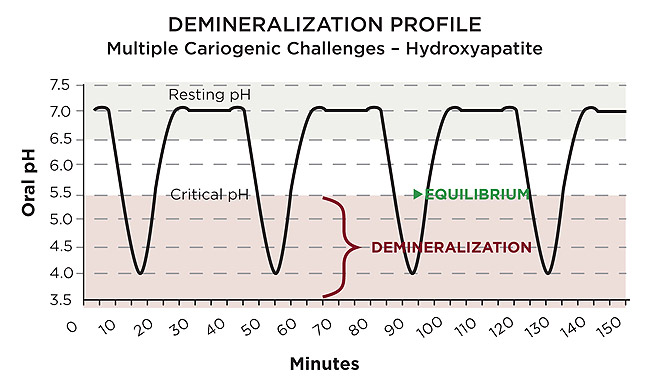 Caries progression is slow because saliva is supersaturated with calcium and phosphate ions under normal physiological conditions (pH 7). However, as bacteria continue to produce acid during sugar challenges, the plaque pH falls to between 4.5 and 5.5, and the driving force is shifted to mineral dissolution.1 The lower the pH, the higher the concentrations of calcium and phosphate required to reach saturation with respect to hydroxyapatite. In other words, as the pH is lowered, the saturation point of the minerals in the surrounding fluid is changed. This is called the “critical pH,” and it is the point at which equilibrium exists. There is no mineral dissolution nor any mineral precipitation. The critical pH of hydroxyapatite is approximately 5.5; that of fluorapatite is approximately 4.5. This varies with individual patients. Below critical pH, demineralization occurs, while above critical pH, remineralization occurs (Figure 1 and Figure 2). The critical pH is significantly higher for children than adults, meaning that at a given pH, children are more prone to demineralization. This puts children at greater risk for demineralization than adults.3