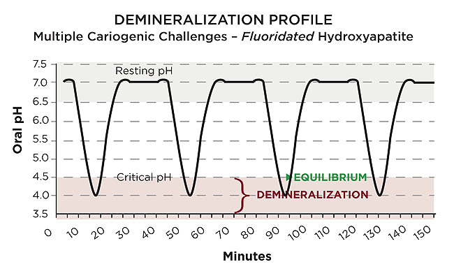 2. Fluoride enhances remineralization. When the pH returns to above 5.5, the saliva, which is supersaturated with calcium and phosphate, provides a driving force for mineral to go back into the tooth.5 Fluoride will adsorb to the surface of the partially demineralized crystals and attract calcium ions. The newly formed surface veneer will preferentially take up fluoride from the solution surrounding the crystals and exclude carbonate.5 Fluoride speeds up the growth of the new surface by bringing calcium and phosphate ions together and is preferentially included in the end-product, which now has a lower solubility. The remineralized surface is more resistant to acid challenges.