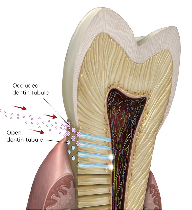 NovaMin (GlaxoSmithKline, www.gsk.com) is described as an inorganic amorphous calcium sodium phosphosilicate (CSPS). It belongs to a class of materials known as “bioactive glasses.” NovaMin and other CSPS materials were originally developed as bone regenerative materials in the early 1970s. Until the invention of bioactive glass, all biomaterials were made to be as inert as possible in the human body.11 The discovery that a synthetic biomaterial could form a chemical bond with bone proved that biomaterials could be engineered to interact with the body, and it was not necessary or even advantageous to minimize these interactions. Bioactive glasses facilitate hydroxyapatite deposition when exposed to fluids containing calcium and phosphate.12 In the presence of water or saliva, NovaMin rapidly releases sodium ions. This increases the local pH and initiates the release of calcium and phosphate. Numerous studies have shown that the NovaMin particles act as reservoirs to continuously release calcium and phosphate ions into the local environment. This may continue over many days.13 As the reactions and deposition of calcium-phosphate complexes continue, this layer crystallizes to hydroxycarbonate apatite, which is chemically and structurally similar to biological apatite.14 NovaMin has been incorporated into toothpastes, gels, and prophy pastes.