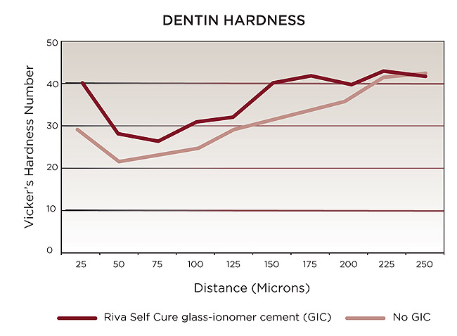 Glass-ionomer cements (eg, Riva Self Cure, SDI, www.sdi.com; GC Fuji IX™, GC America, Inc., www.gcamerica.com; ChemFil® Rock, DENTSPLY Caulk, www.dentsply.com) are especially valuable for initial carious lesions, abfractions/erosions/abrasions, and for caries control in patients who are at high risk for caries.28 Glass ionomers have a true chemical bond with dental tissue. They are bioactive, encourage remineralization of the surrounding tooth structure, and prevent bacterial microleakage through the ion-exchange adhesion that they develop with both enamel and dentin.29 This creates a new, ion-enriched material at the tooth–glass-ionomer interface. This material consists of phosphate and calcium ions from the dental tissues, and calcium (or strontium), phosphate, and aluminum from the glass-ionomer cement.29 This remineralization creates a harder dentin surface (Figure 6).30 Restoration failure is usually cohesive, leaving the ion exchange layer firmly attached to the cavity wall and the dentinal tubules sealed and protected against bacteria penetration.31 Fluoride is the catalyst for remineralization, aided by calcium (or strontium) and phosphate. The pattern of release for all the ions in glass-ionomer cement is similar, and this is enhanced by a low pH.32