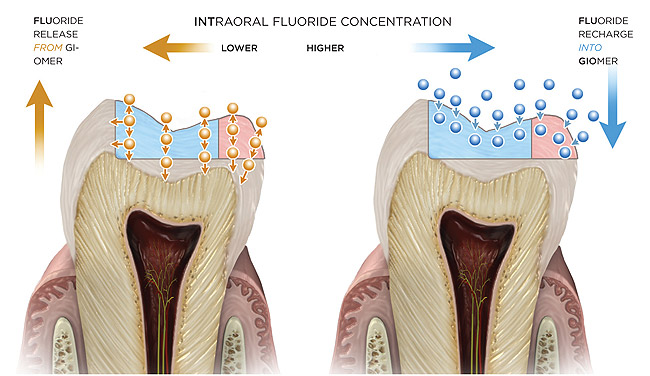 The giomer concept is based on pre-reacted glass (PRG) technology; pre-reacted glass particles—surrounded by a glass-ionomer phase—are enclosed within a polyacid matrix (Figure 7). Studies show dentin remineralization occurs at the preparation surface adjacent to the giomer.35 Giomers are also able to take up extra fluoride (after using fluoride toothpaste, rinse, varnish, etc.) in the oral fluids and then act as a reservoir until the fluoride is needed. This is termed “fluoride release and recharge” (Figure 8). Giomers release and recharge fluoride efficiently and significantly better than compomers36 and composite resins—although not as well as glass ionomers.37 Giomer fissure sealants have superior recharge and release of ions when compared to resin sealants. Hence, they can work actively to decrease demineralization and increase remineralization in young teeth at their most caries-susceptible stage.38