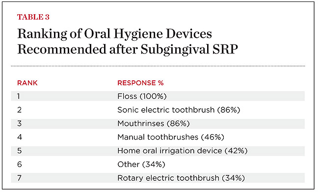 The most popular oral hygiene devices recommended after SRP were floss, mouthrinses, and sonic electric toothbrushes (Table 3). On the survey, many of those surveyed mentioned the use of proxy brushes and rubber-tip stimulators in the “Other” box. Home oral irrigation was recommended by 42% of respondents. Home oral irrigation devices are statistically and clinically effective at reducing gingival inflammation and periodontal disease activity.18-20 Daily home oral irrigation with water has been shown to be as effective at reducing gingival inflammation as rinsing with 0.12% chlorhexidine twice daily.19 In patients with adequate dexterity, water irrigation may be a cost-effective alternative to prescription mouthrinses with fewer side effects.